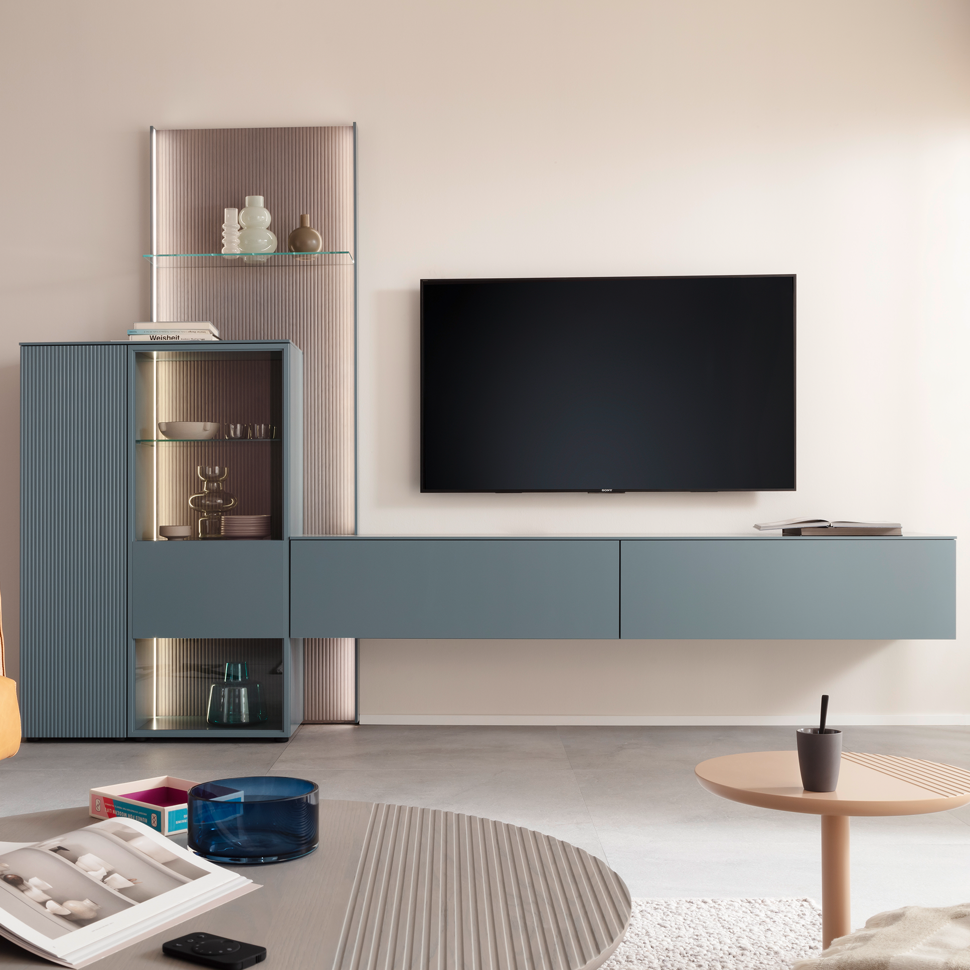 Durchdachte Details wie ein Medienelement mit perforiertem Lochblech für optimalen Sound, ein praktisches Kabelmanagement und lackierte Alu-Rahmentüren mit verdeckten Beschlägen setzen Akzente. Alle Schübe verfügen über einen Vollauszug. Dimmbare LED-Bänder mit verschiedenen Farbstufen sorgen für stimmungsvolles Licht und betonen die besondere Ausstrahlung der Möbel. Die Technik ist komfortabel per Fernbedienung steuerbar.