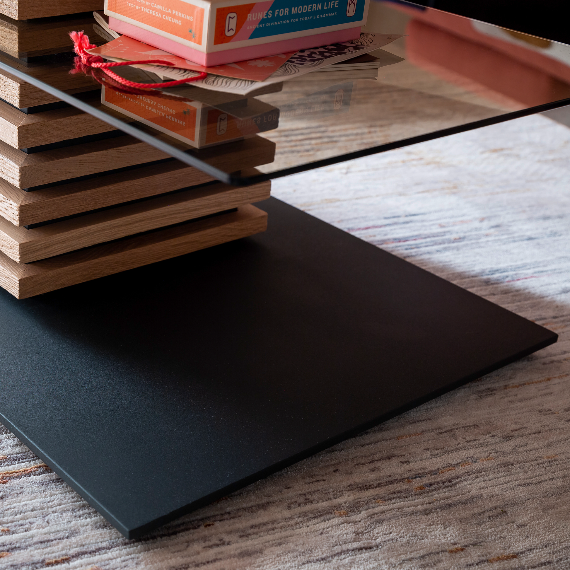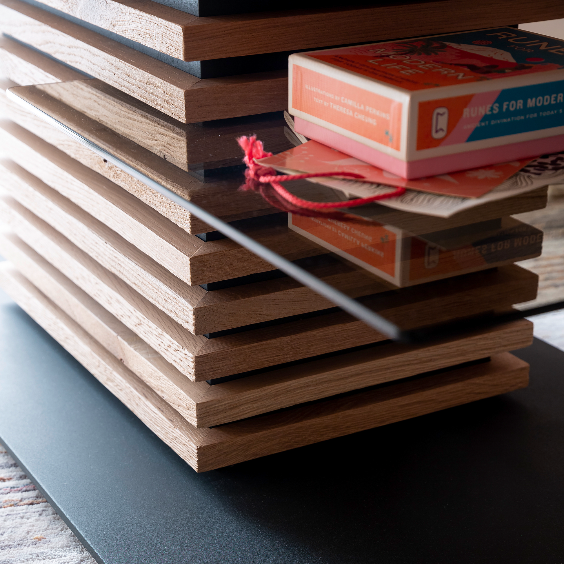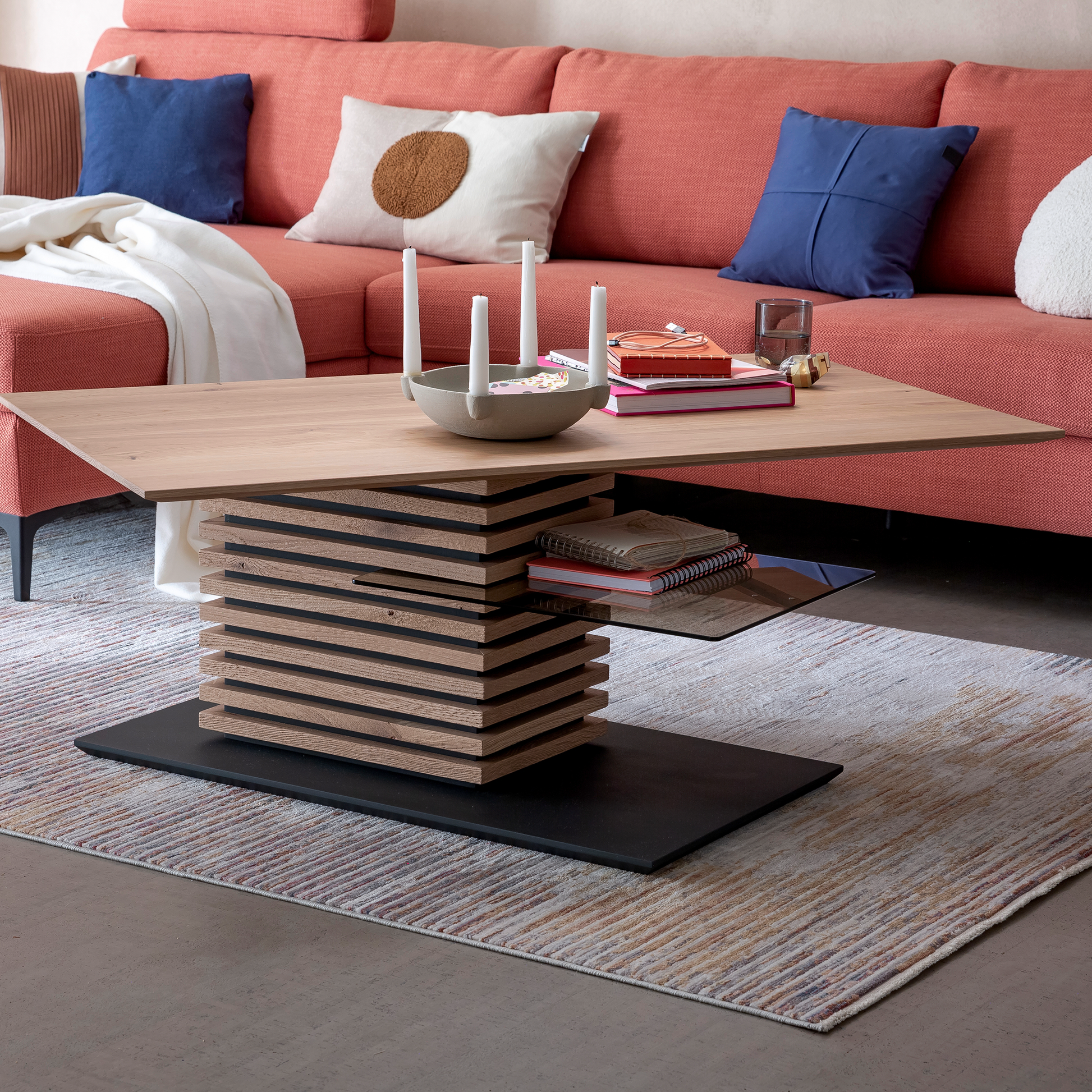 Praktisch und stilvoll zugleich: Die Ablage aus getöntem Parsolglas unterhalb der Platte bietet dezenten Stauraum für Fernbedienung, Zeitschriften oder andere Kleinigkeiten. Der Fuss in elegantem Anthrazit ist mit einem umweltfreundlichen Wasserlack veredelt – für ein bewusstes Wohngefühl.