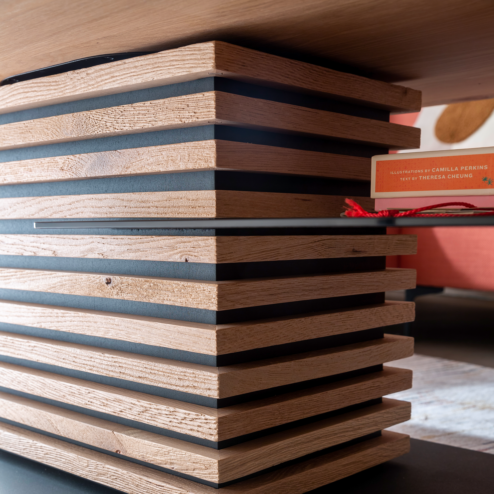 Die drehbare Tischplatte aus massiver Kerneiche Natur bietet nicht nur Flexibilität, sondern auch eine warme, natürliche Ausstrahlung. Getragen wird sie von einer aussergewöhnlichen Lamellen-Säule aus sandgestrahlter Kerneiche, die dem Tisch seinen unverwechselbaren Charakter verleiht.