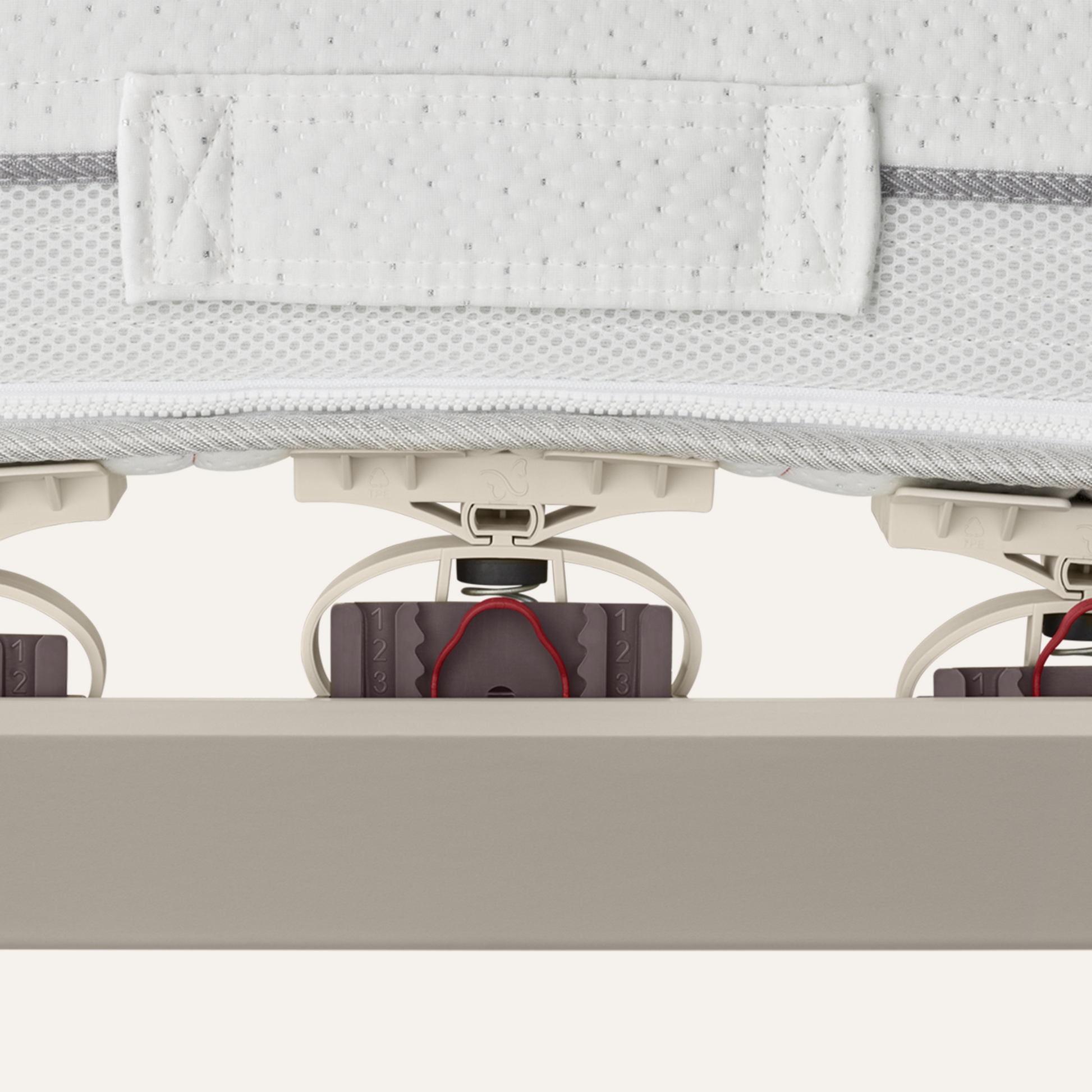 Der freischwebende Systemrahmen mit einem extrem hohen Federweg bis über die Randzonen hinaus bewirkt eine bislang noch nie erreichte Anpassungsfähigkeit. Das ausgeklügelte Federelement mit ermüdungsfreien Spiralfedern fängt jeden Druck subtil und selbstregulierend auf. Jedes einzelne Federelement ist zusätzlich in der Höhe verstellbar und erlaubt eine individuelle Anpassung an jede Körperkontur. Optional mit Kopf-, Rücken- und Fusshochlagerung. Manuell oder mit Motor.