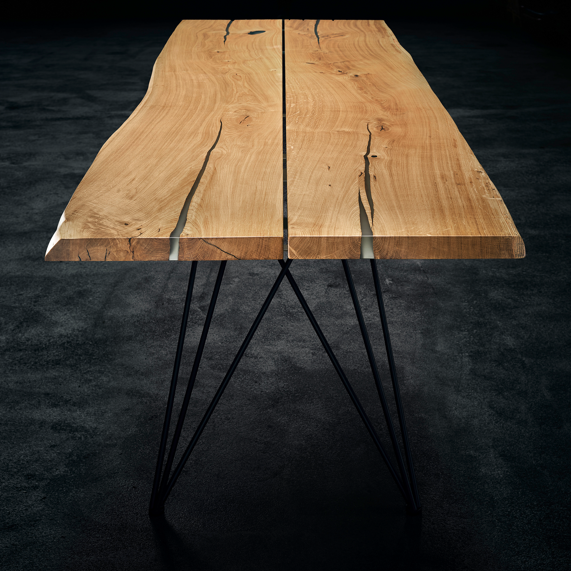 Löcher, Risse und Asteinschlüsse werden mit transluzentem Epoxidharz gefüllt. So werden diese gut sichtbar in Szene gesetzt und Ihr Tisch kann dennoch leicht gereinigt werden.
