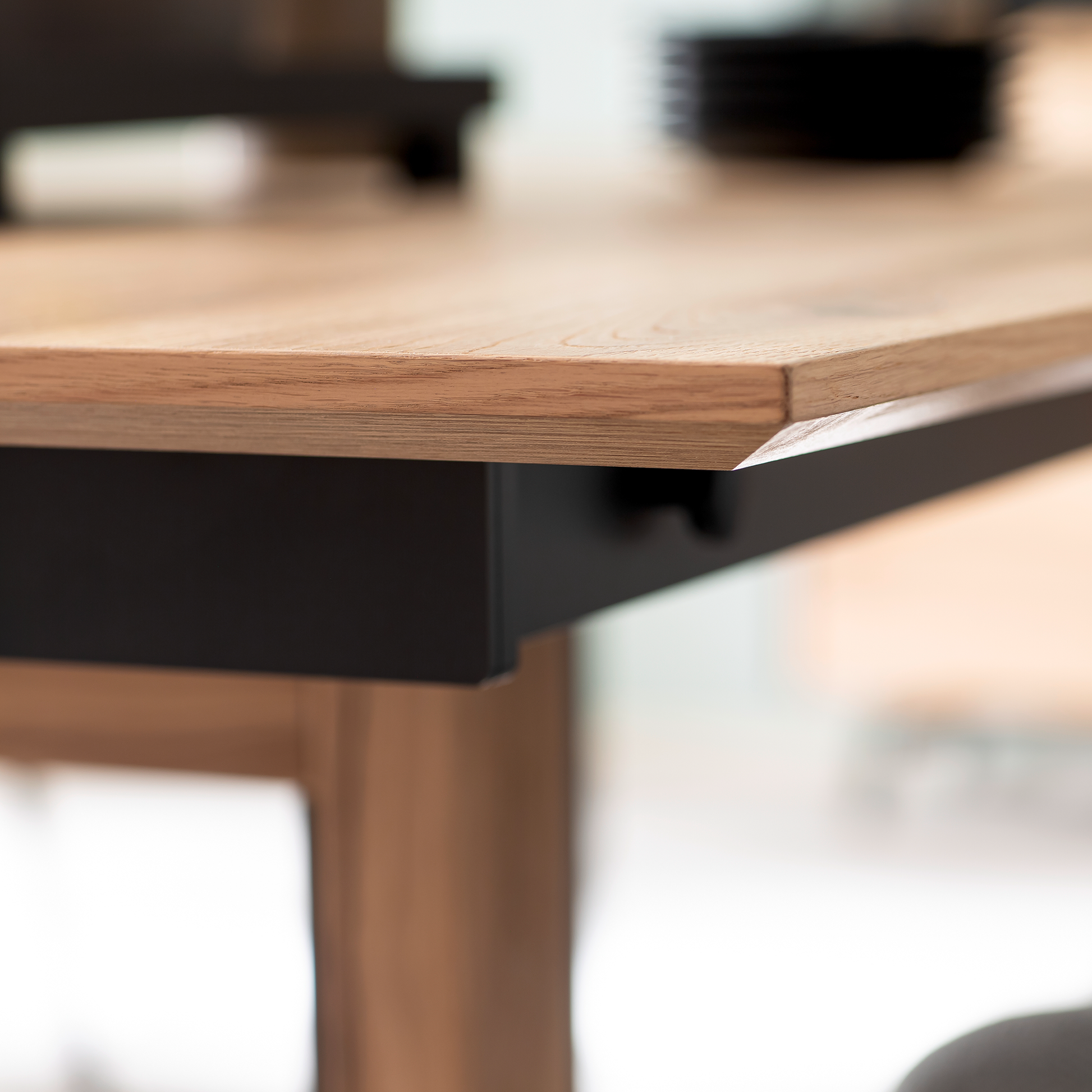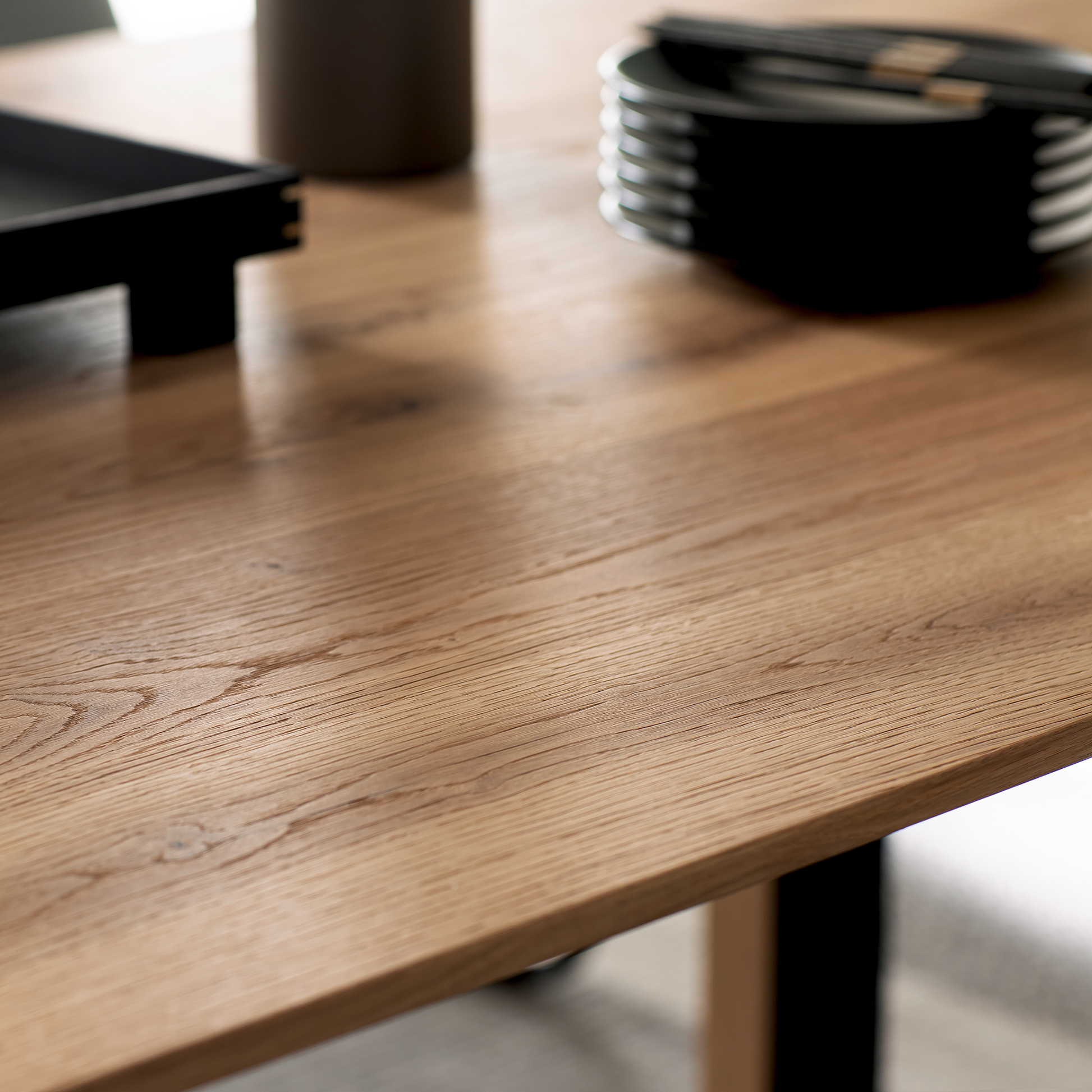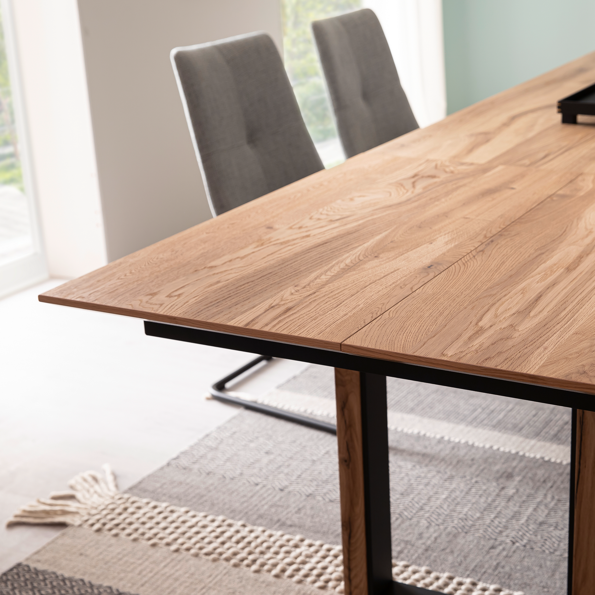 Der Esstisch CROSS überzeugt mit seinem markanten Untergestell und cleverer Funktion: Dank Vorkopfauszug mit Rollen lässt er sich ganz leicht verlängern – ohne Anheben, ohne Kraftakt. Die optionale Klappeinlage macht ihn noch flexibler.