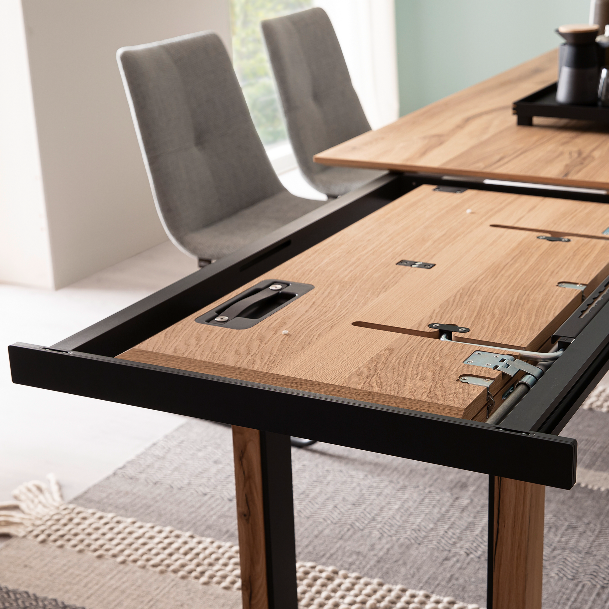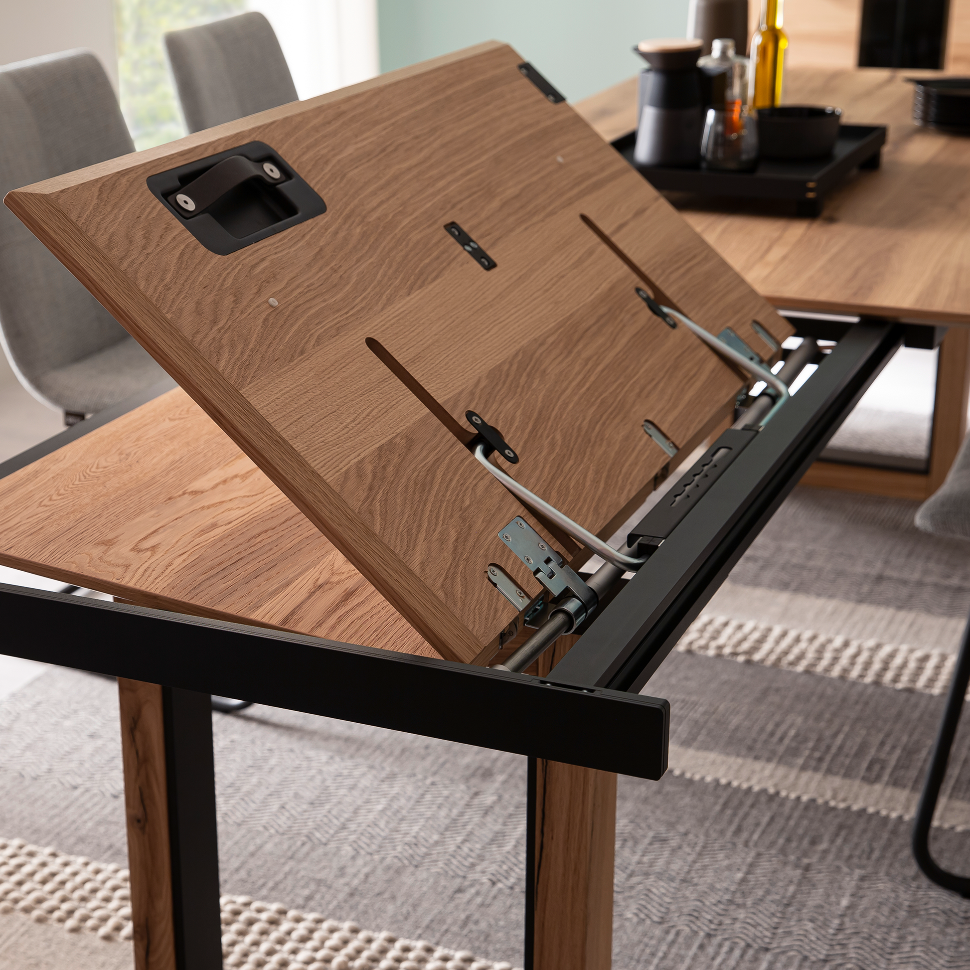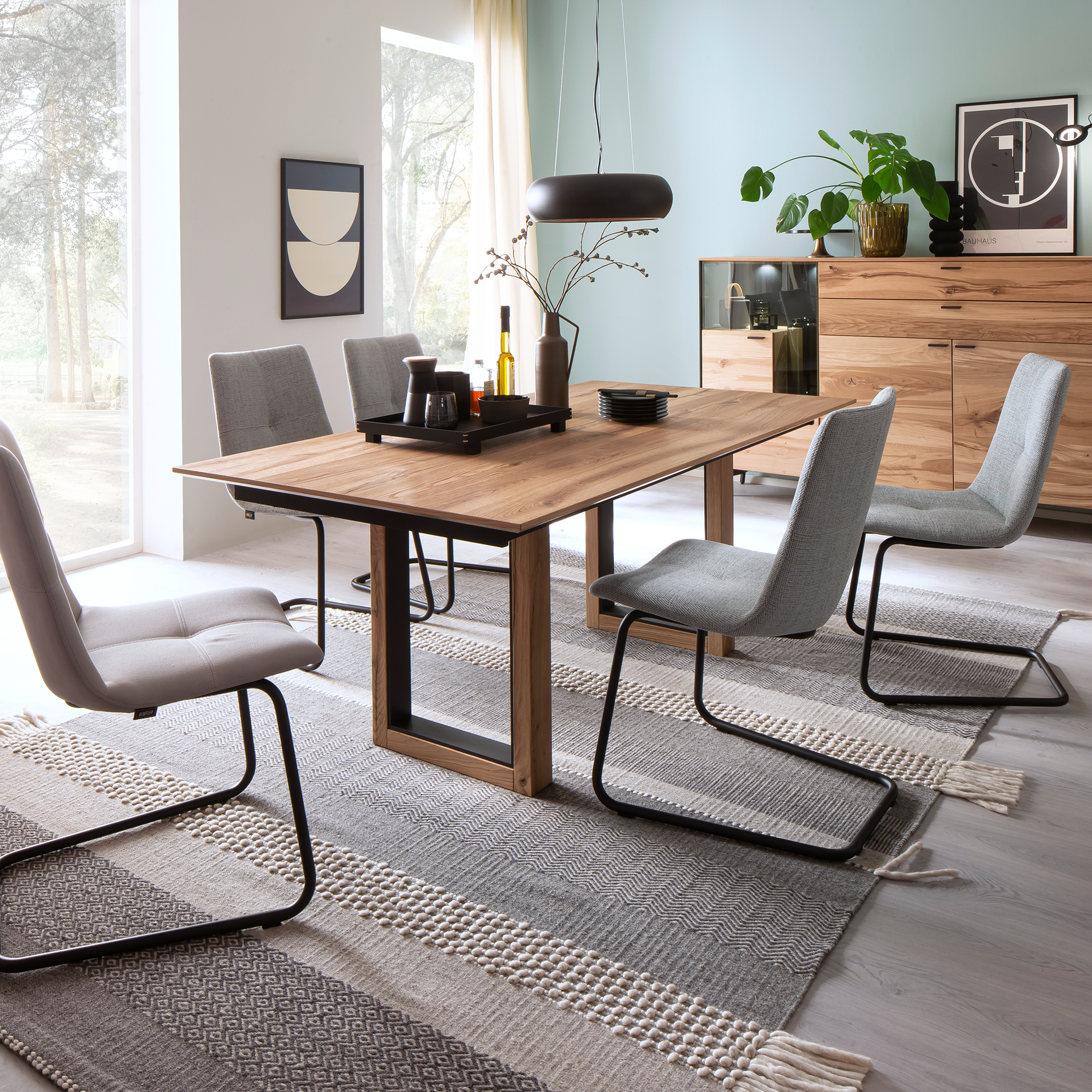 Der Esstisch CROSS überzeugt mit seinem markanten Untergestell und cleverer Funktion: Dank Vorkopfauszug mit Rollen lässt er sich ganz leicht verlängern – ohne Anheben, ohne Kraftakt. Die optionale Klappeinlage macht ihn noch flexibler.