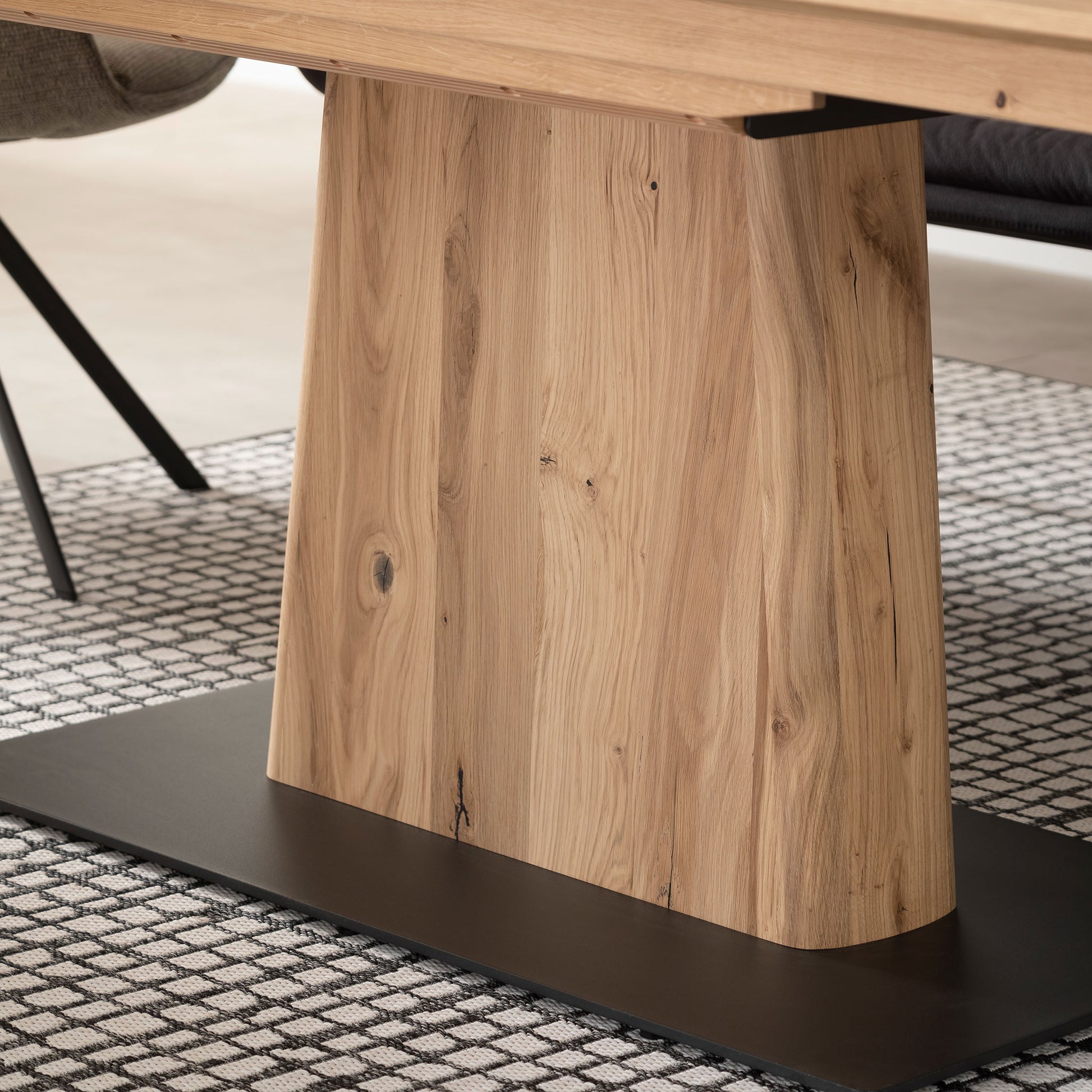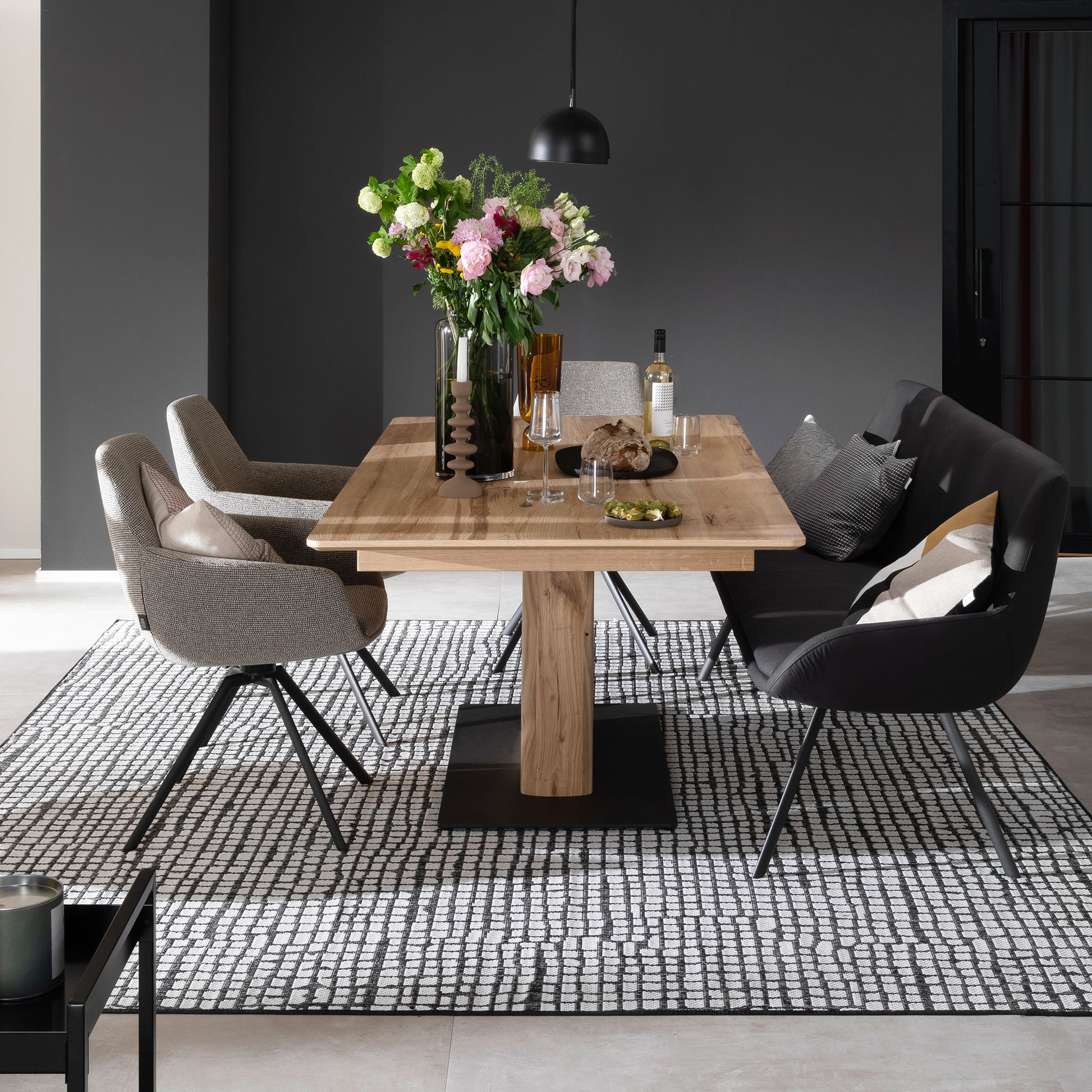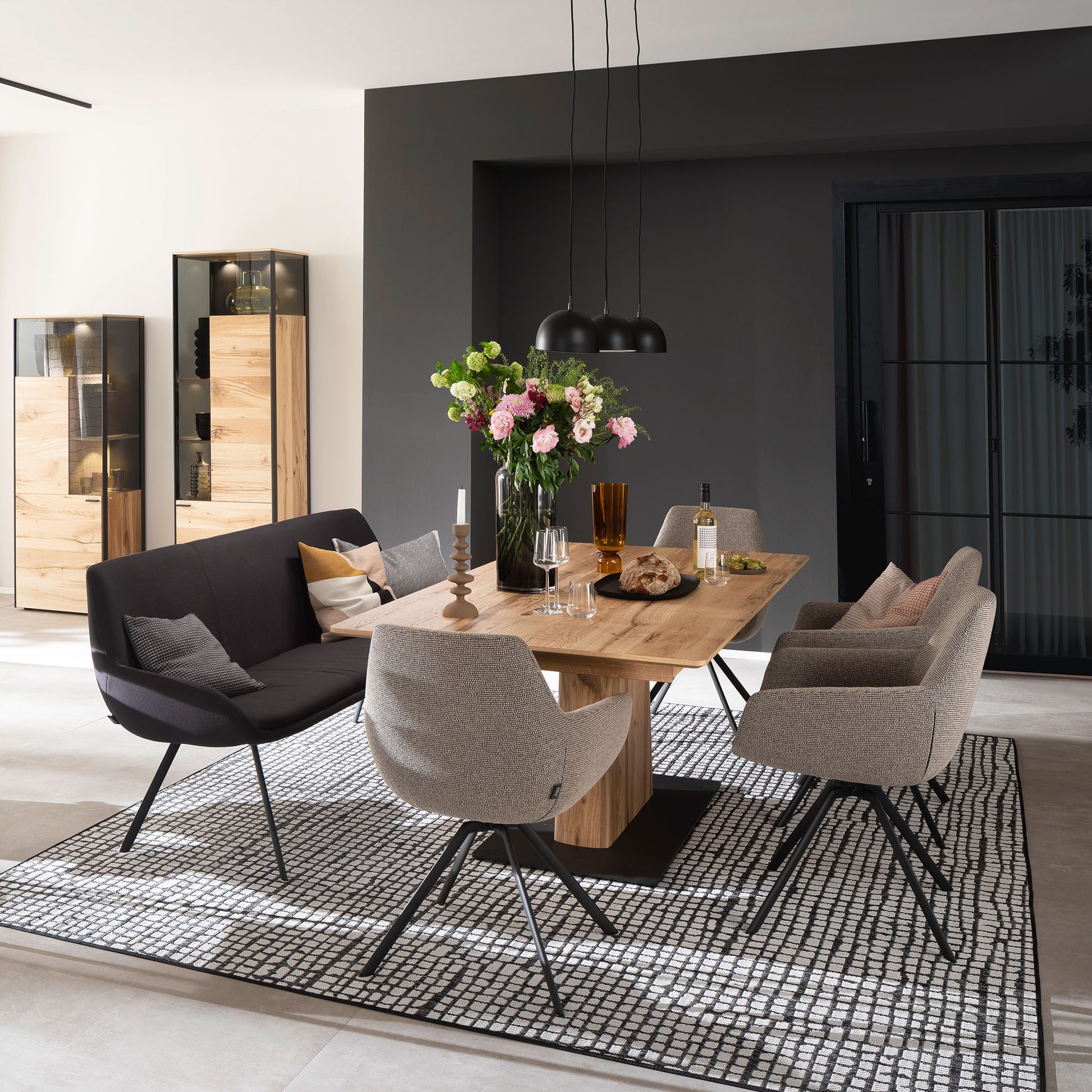 EASY zeigt, wie wohnlich und vielseitig Holz sein kann: Wählen Sie aus edlen Ausführungen wie Eiche rustico hell geölt, Wildeiche hell oder soft gebürstet oder Eiche schwarz lackiert. Drei Tischgrößen stehen zur Auswahl – optional mit cleverer Klappeinlage für spontane Gäste.