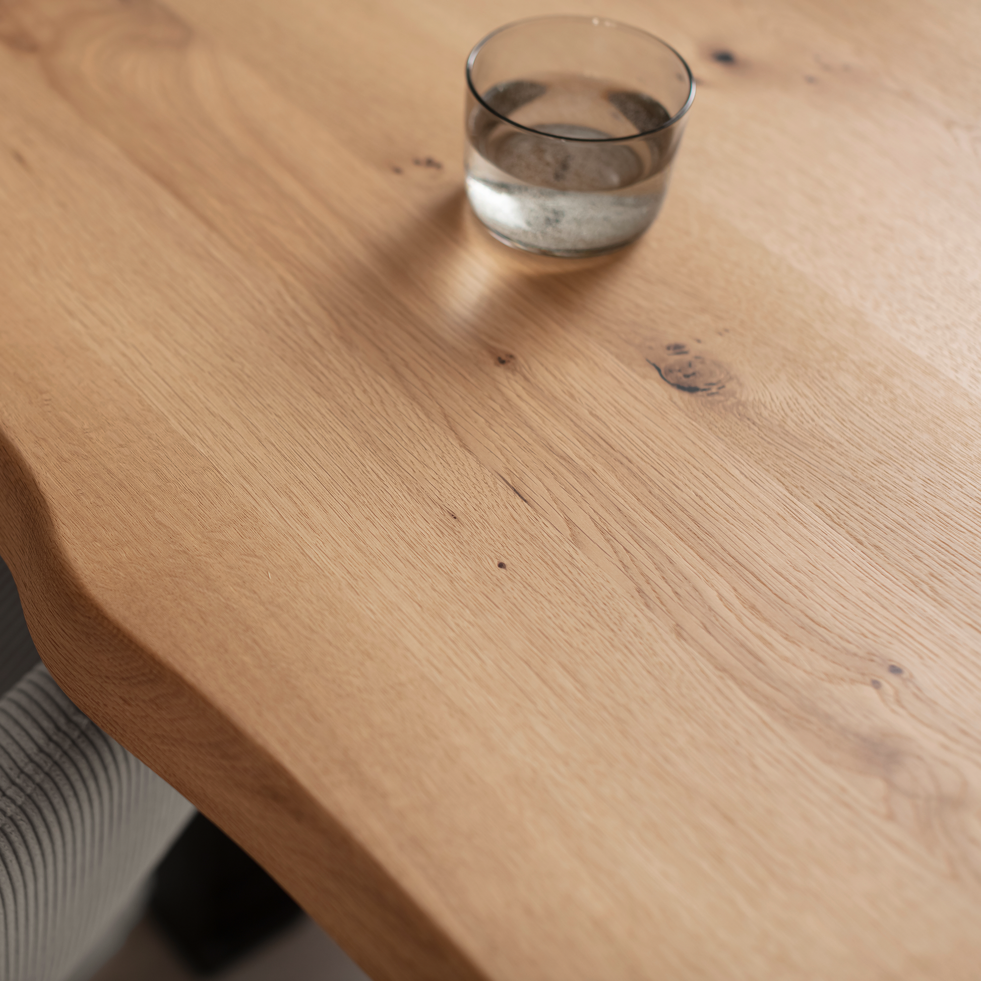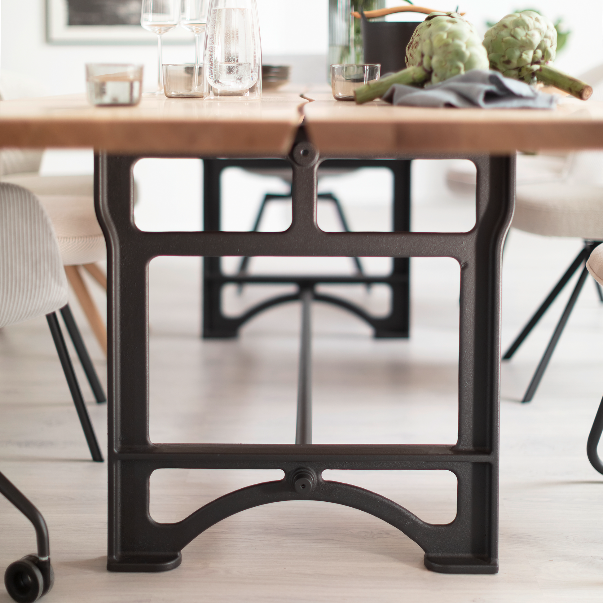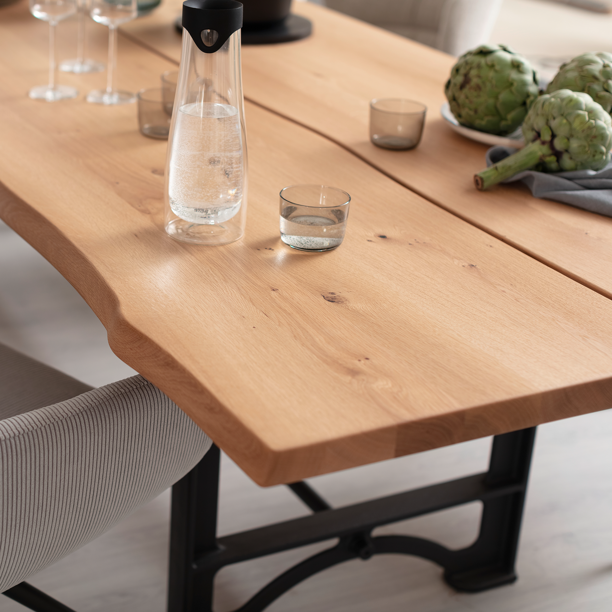 Mit TALE zieht ein echtes Charakterstück bei Ihnen ein. Die massive Tischplatte in Baumkantenoptik – wahlweise aus edler Wildeiche oder aus elegantem Nussbaum – ruht auf einem Gusseisengestell, das Geschichte atmet: Einst trugen solche Füsse Werkbänke in alten Manufakturen, heute verleihen sie Ihrem Zuhause industriellen Charme mit Seele.
