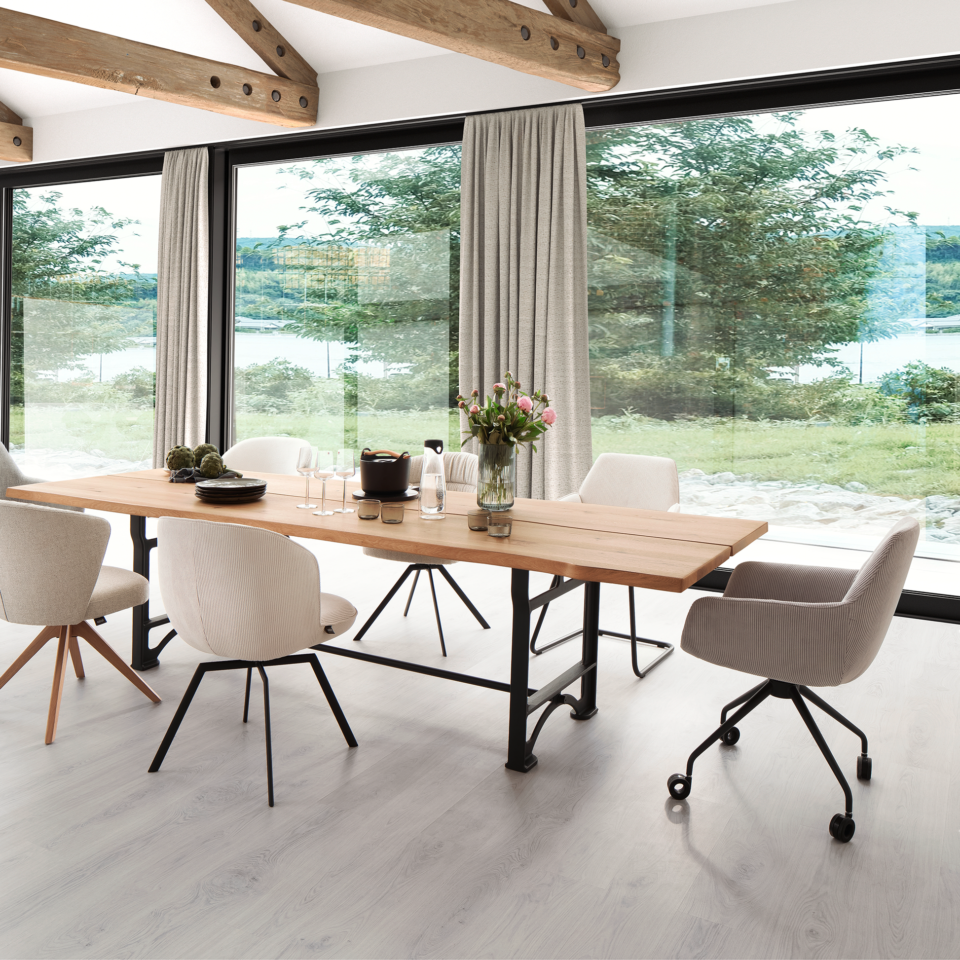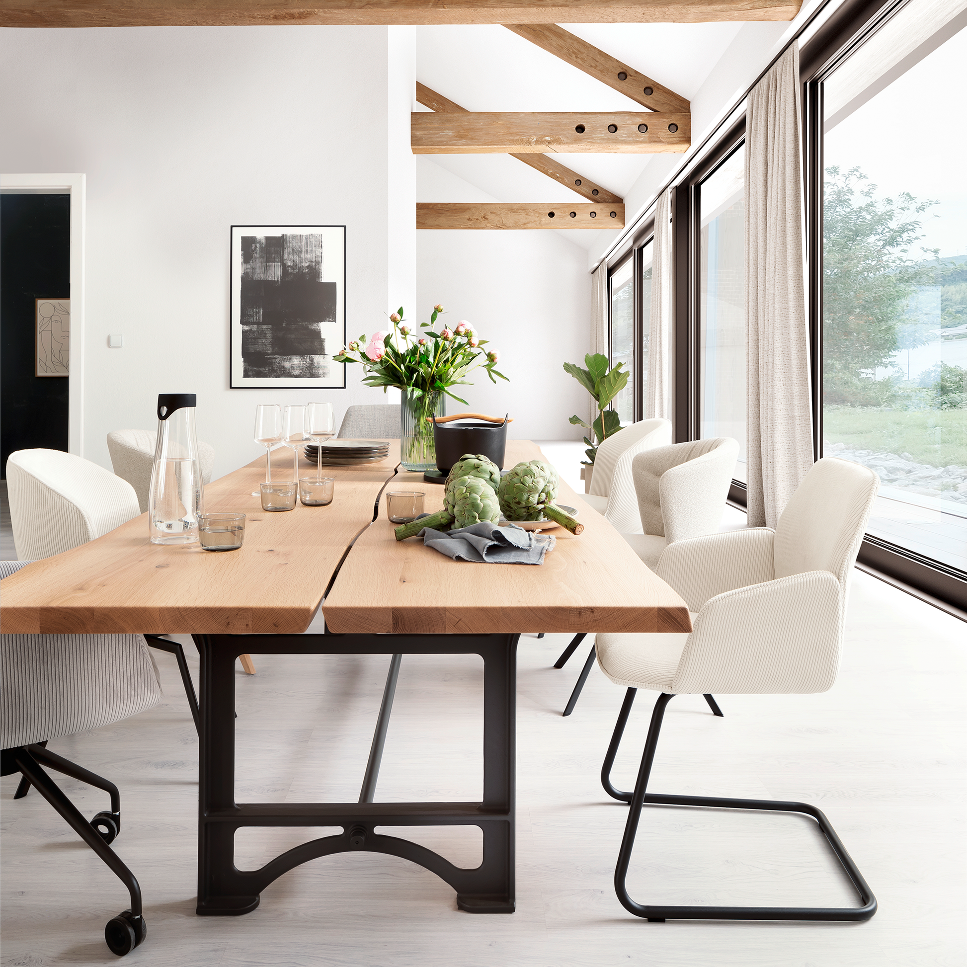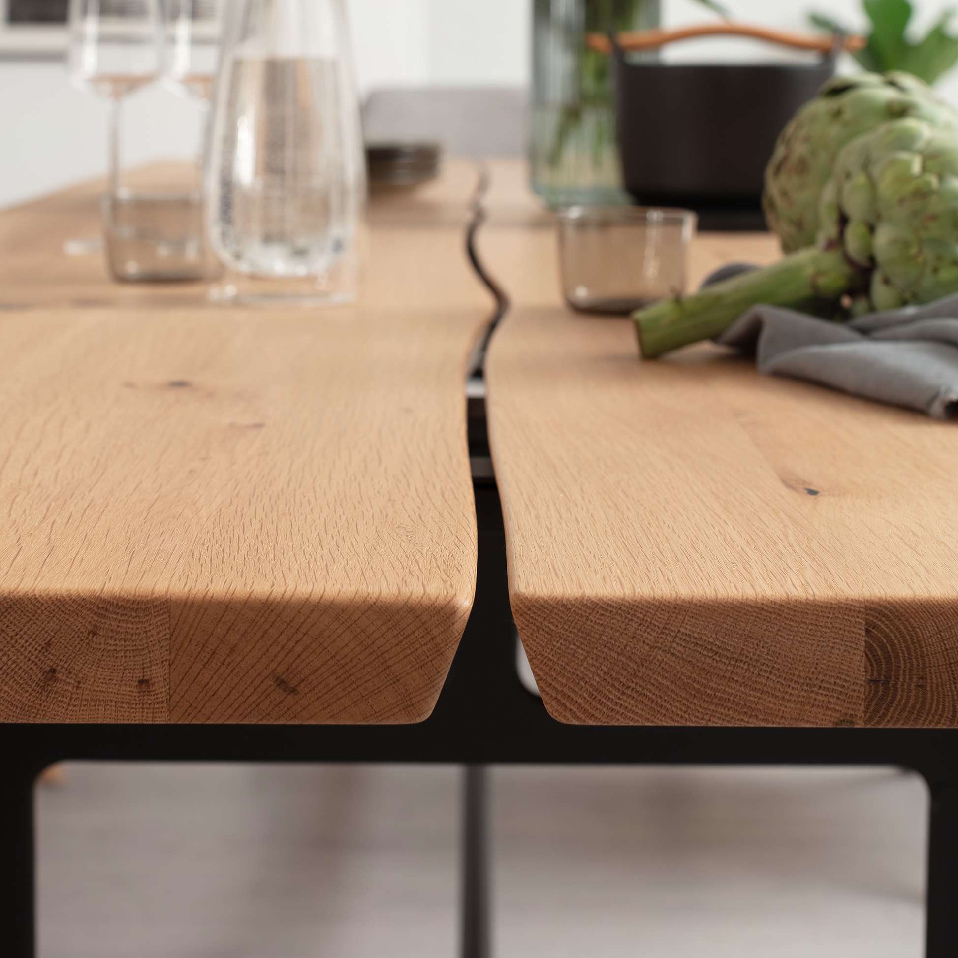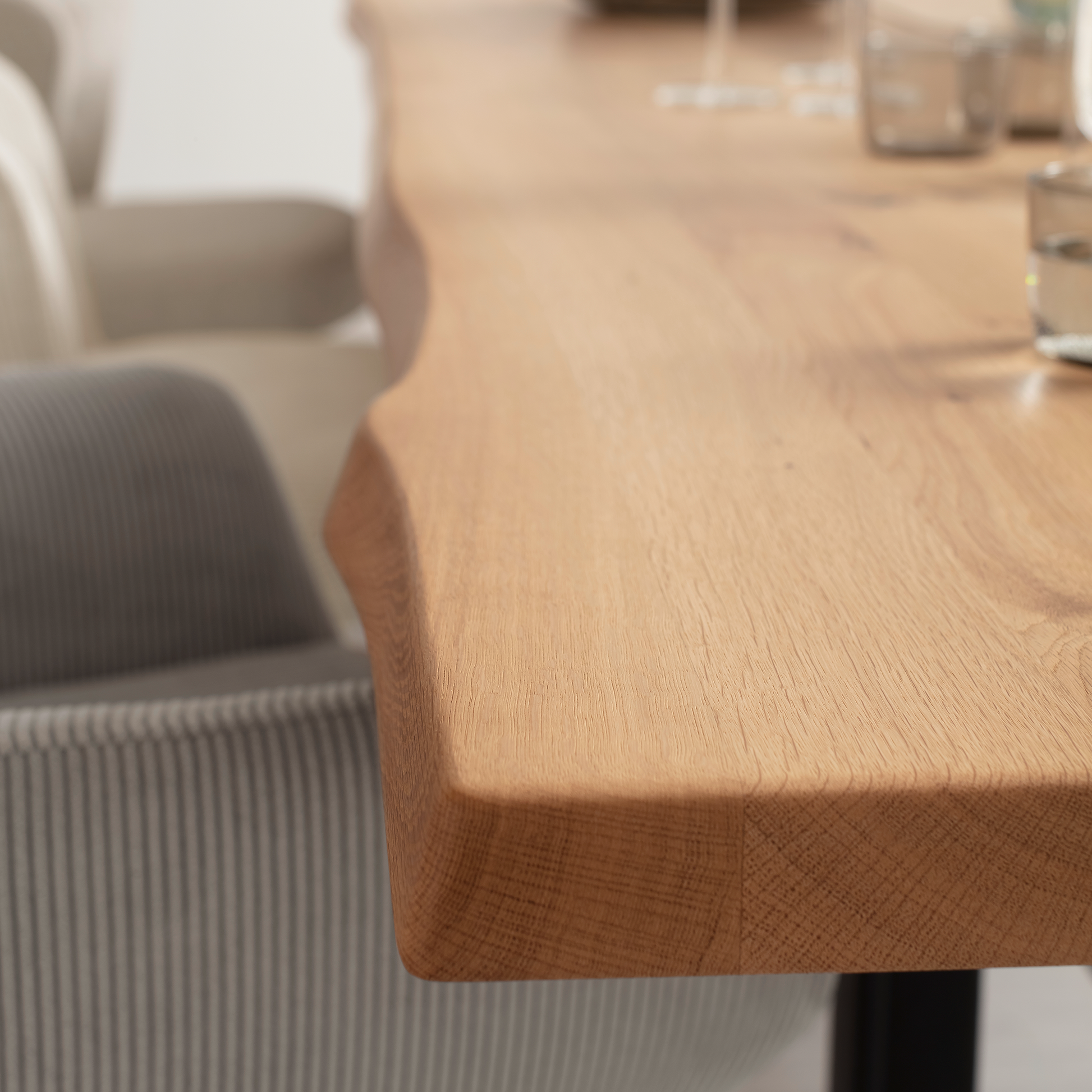 Mit TALE zieht ein echtes Charakterstück bei Ihnen ein. Die massive Tischplatte in Baumkantenoptik – wahlweise aus edler Wildeiche oder aus elegantem Nussbaum – ruht auf einem Gusseisengestell, das Geschichte atmet: Einst trugen solche Füsse Werkbänke in alten Manufakturen, heute verleihen sie Ihrem Zuhause industriellen Charme mit Seele.