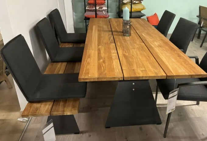Diese exklusive Gartentischgruppe besteht aus einem massiven, gebürsteten Teak-Tisch und einer passenden Bank (ohne Stühle).