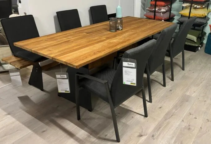 Mit pulverbeschichteten Stahl-Winkelwangen in Anthrazit und einem Teaksteg vereint sie stilvolles Design mit robusten Materialien. Perfekt für Ihren Aussenbereich.