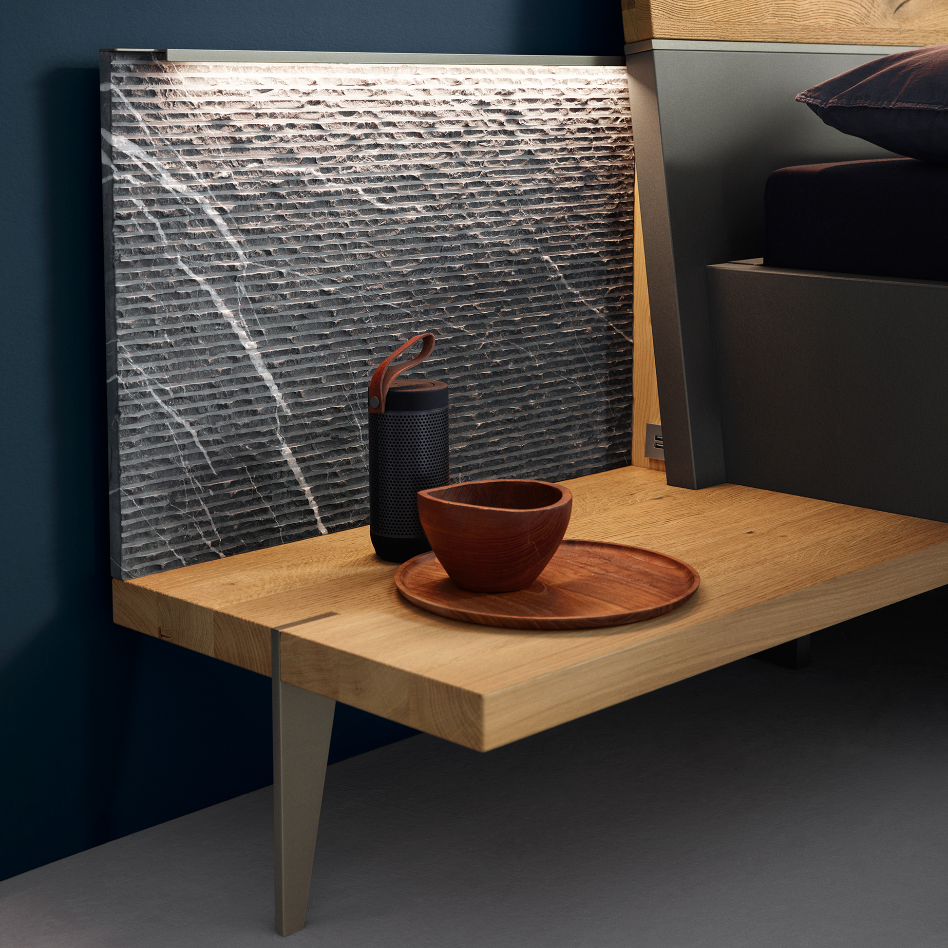 Natürliche Wärme und ein Hauch Extravaganz. Wo edelster Naturstein auf gebürstete Wildeiche und graphitfarbige Lackelemente trifft, wird Schlafen zur schönsten Nebensache der Welt.