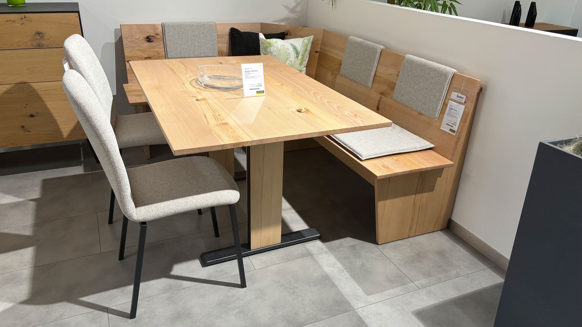 Diese hochwertige Tischgruppe AROSA verbindet traditionelles Handwerk mit moderner Wohnlichkeit. Gefertigt aus massiver Wildkernbuche, überzeugt sie durch natürliche Materialien, cleveren Stauraum und stilvolle Details. Die Eckbank mit Sitztruhen bietet nicht nur Platz für Familie & Gäste, sondern auch praktischen Stauraum – ergänzt durch passende Sitz- und Rückenkissen in edlem Stoff Wicotex sol white pepper sowie zwei stilvolle Stühle im gleichen Bezug.