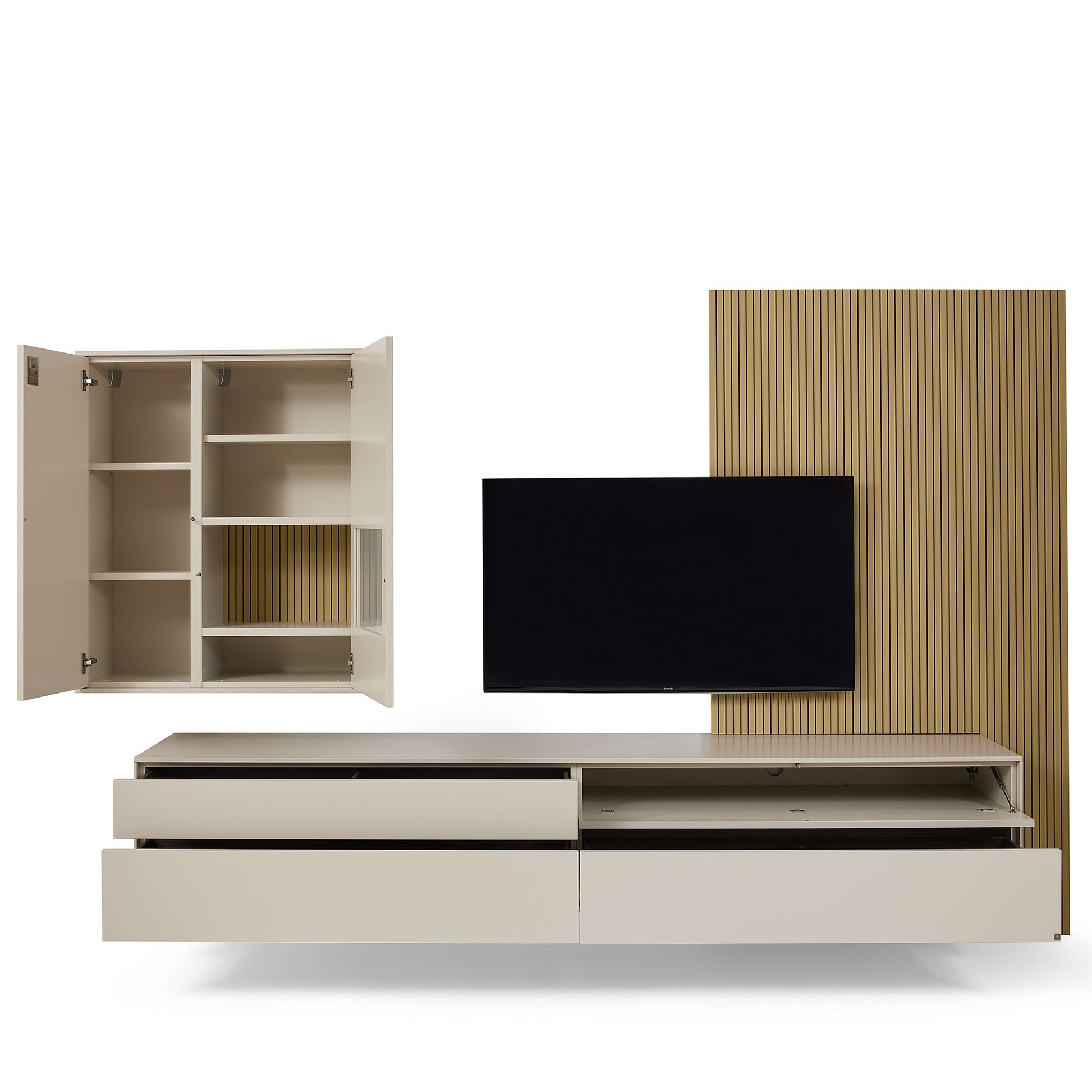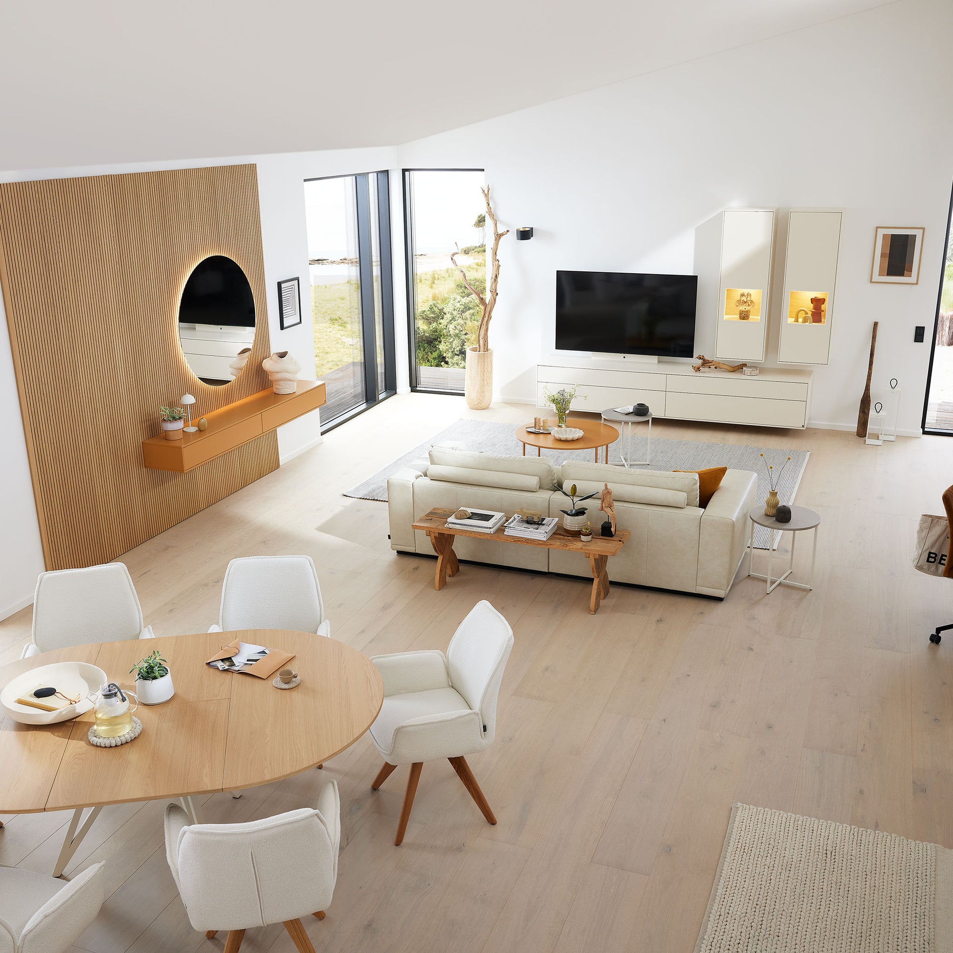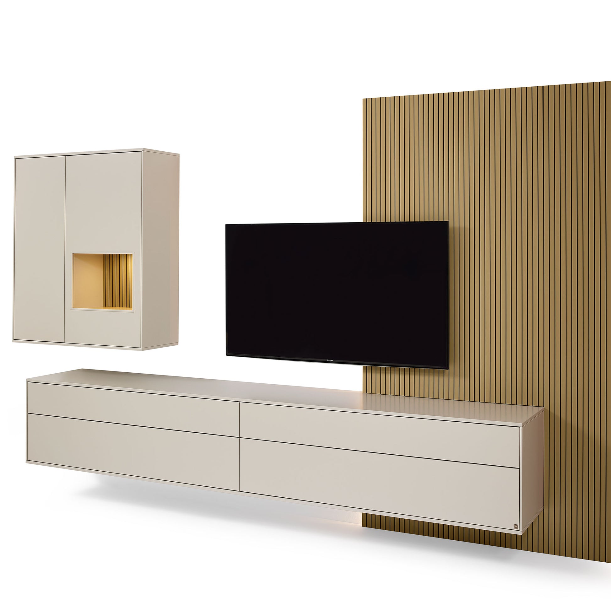 Die Serie punktet mit cleveren Stauraumlösungen, hochwertigen LED-Beleuchtungen und vielfältigen Kombinationsmöglichkeiten. Wandpaneele mit indirekter Beleuchtung, Glaskantenlicht oder beleuchtete Hängeelemente setzen nicht nur Möbel, sondern ganze Räume gekonnt in Szene.