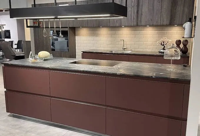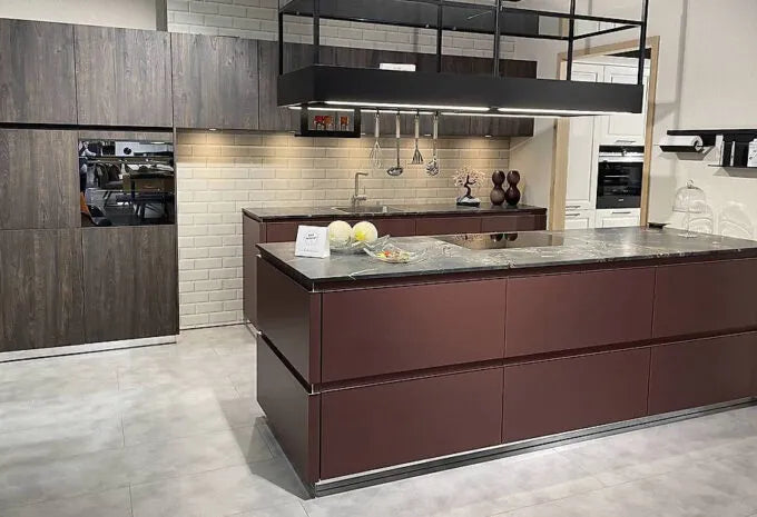 Mit eleganten seidenmatten Lackfronten in der Farbe Acai und stilvollem Holzdekor Maroni bringt diese Bauformat Ausstellungsküche modernen Charme in Ihr Zuhause. Besonders praktisch sind die motorisch öffnenden Hängeschränke. Die Musterküche kann nach Wunsch erweitert werden und enthält eine 20 mm Granitarbeitsplatte sowie hochwertige Elektrogeräte von Electrolux: Kühlschrank, Multifunktions-Backofen mit Pyrolyse, Induktionskochfeld und Geschirrspüler. Dazu gehören auch die Suter Spüle Vantis, die Suter Mischbatterie, das Müllex Abfallsystem und die Dunstabzugshaube Faber Spazio.