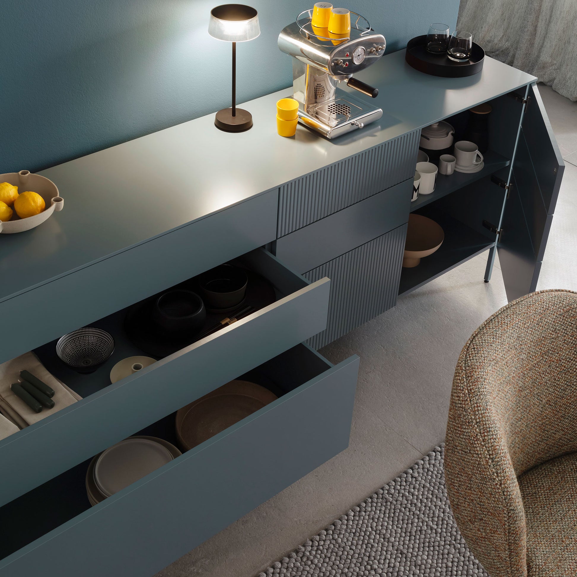Der grifflos gearbeitete Korpus mit dem charakteristischen Lamellendekor verleiht AMAYA eine moderne, elegante Präsenz. Doch was das Möbel wirklich besonders macht, steckt im Inneren – und in den zahllosen Möglichkeiten, die es Ihnen bietet.
