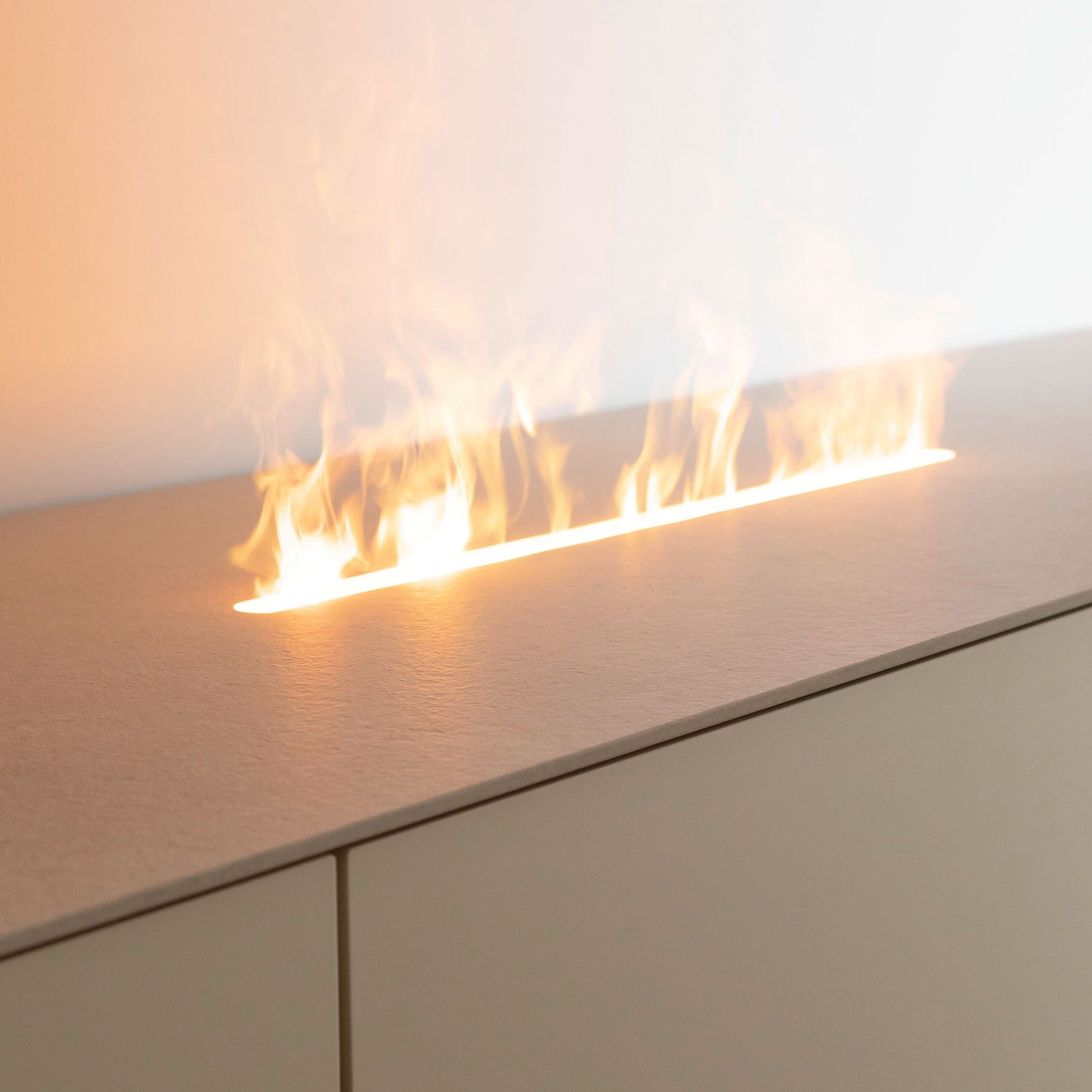 Ein echtes Highlight ist die CUBO Variante mit integriertem Elektrokamin: Hier wurde ein stilvoller Raumteiler geschaffen, der mehr als nur Stauraum bietet. Der eingebaute Wasserdampf-Kamin – auch bekannt als Elektrokamin – erzeugt mit Ultraschall, Licht und Wasserdampf täuschend echte Flammen und Rauch.