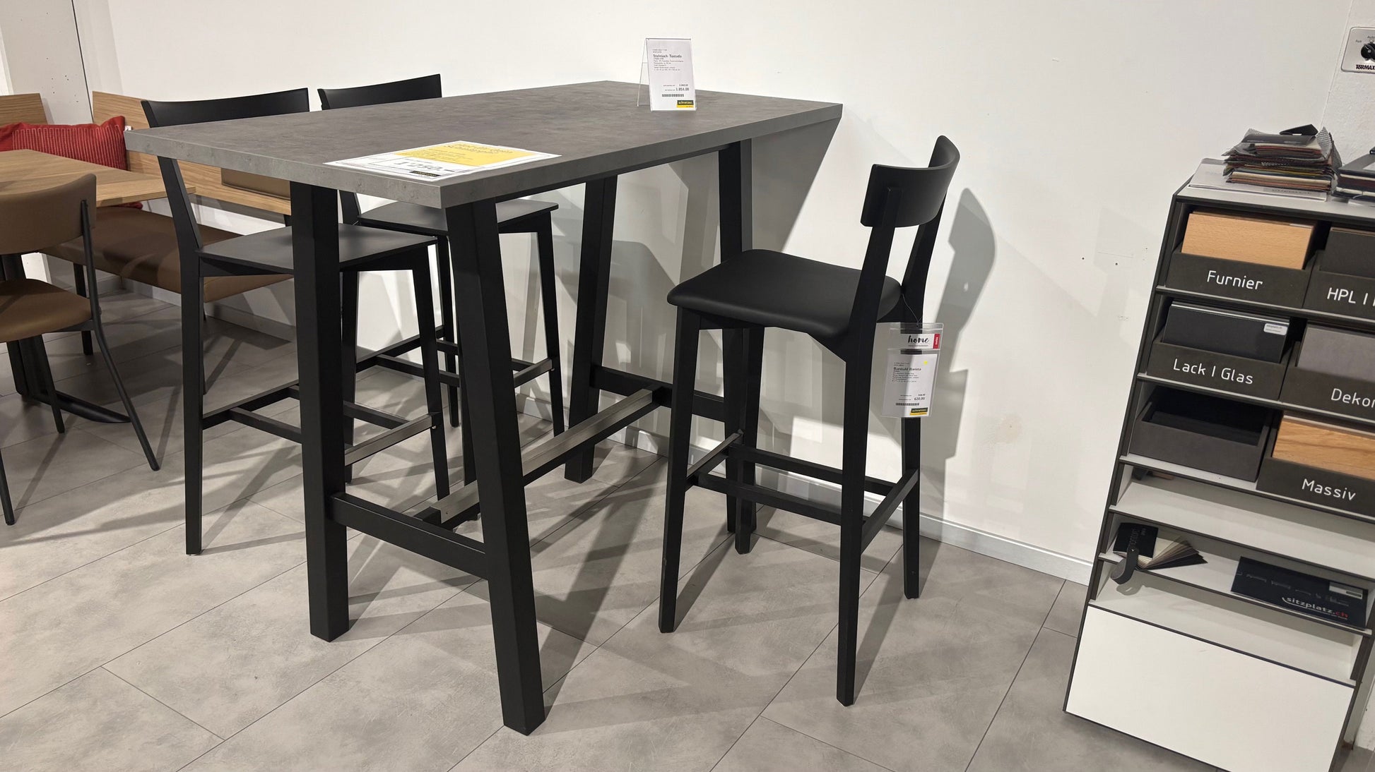 Der Stehtisch TOSTADA bringt Stil und Funktion auf einen Nenner. Die widerstandsfähige HPL-Kunstharzplatte in Stucco Schiefergrau überzeugt mit moderner Beton-Optik und angenehmer Haptik. Das Gestell aus massiver Buche in Schwarz sorgt für Stabilität und einen eleganten Kontrast – ideal für die Küche, die Wohnbar oder den Essbereich mit Stehkomfort.