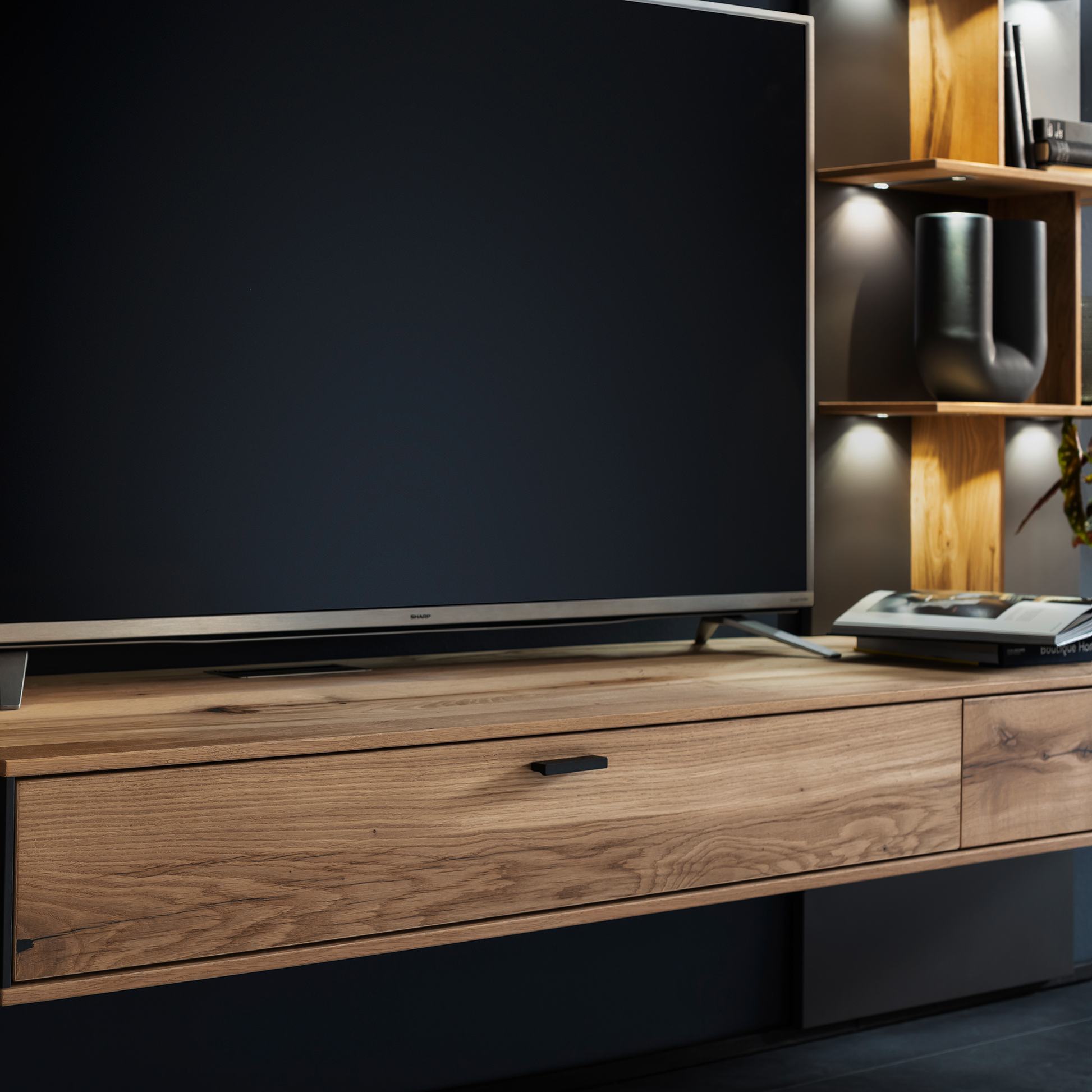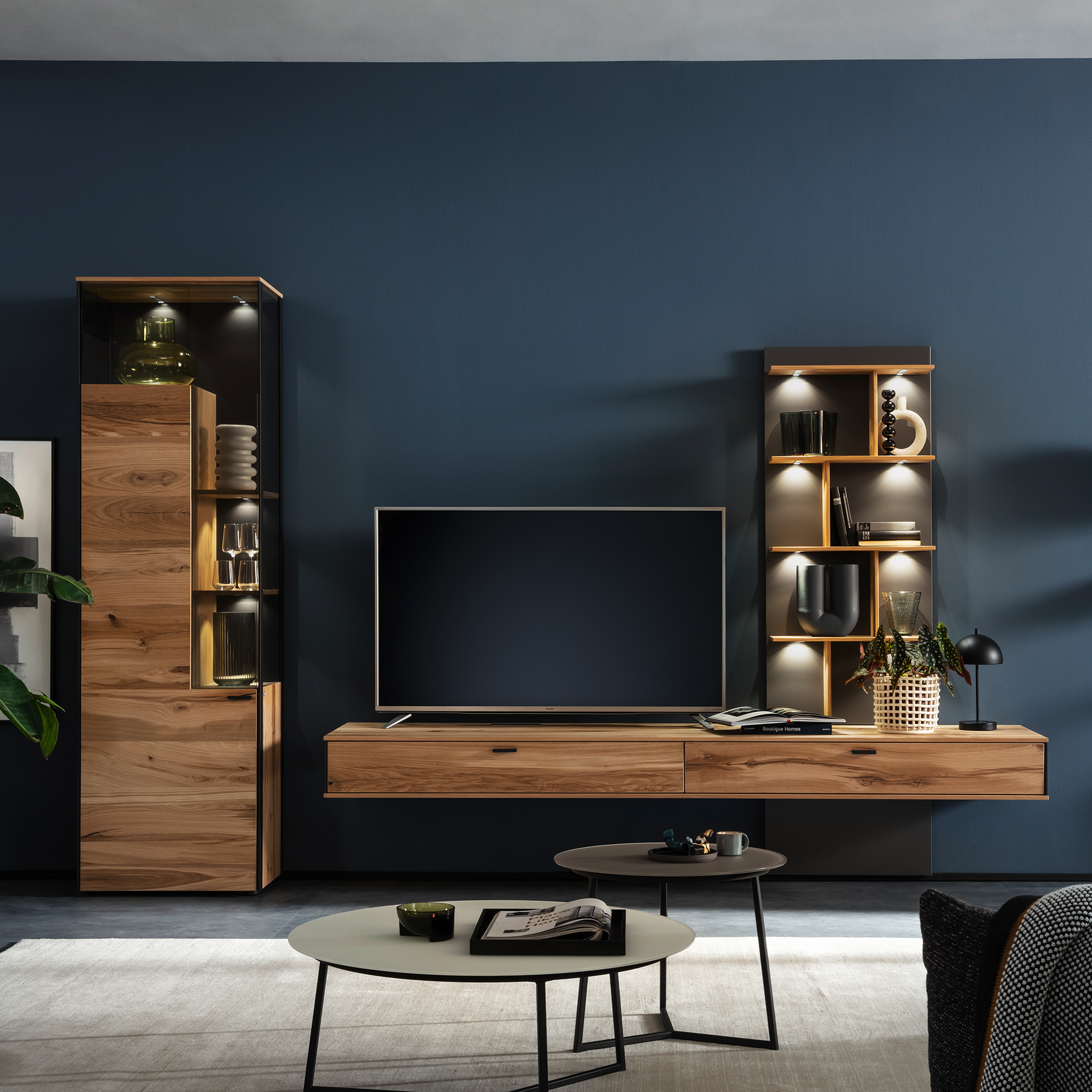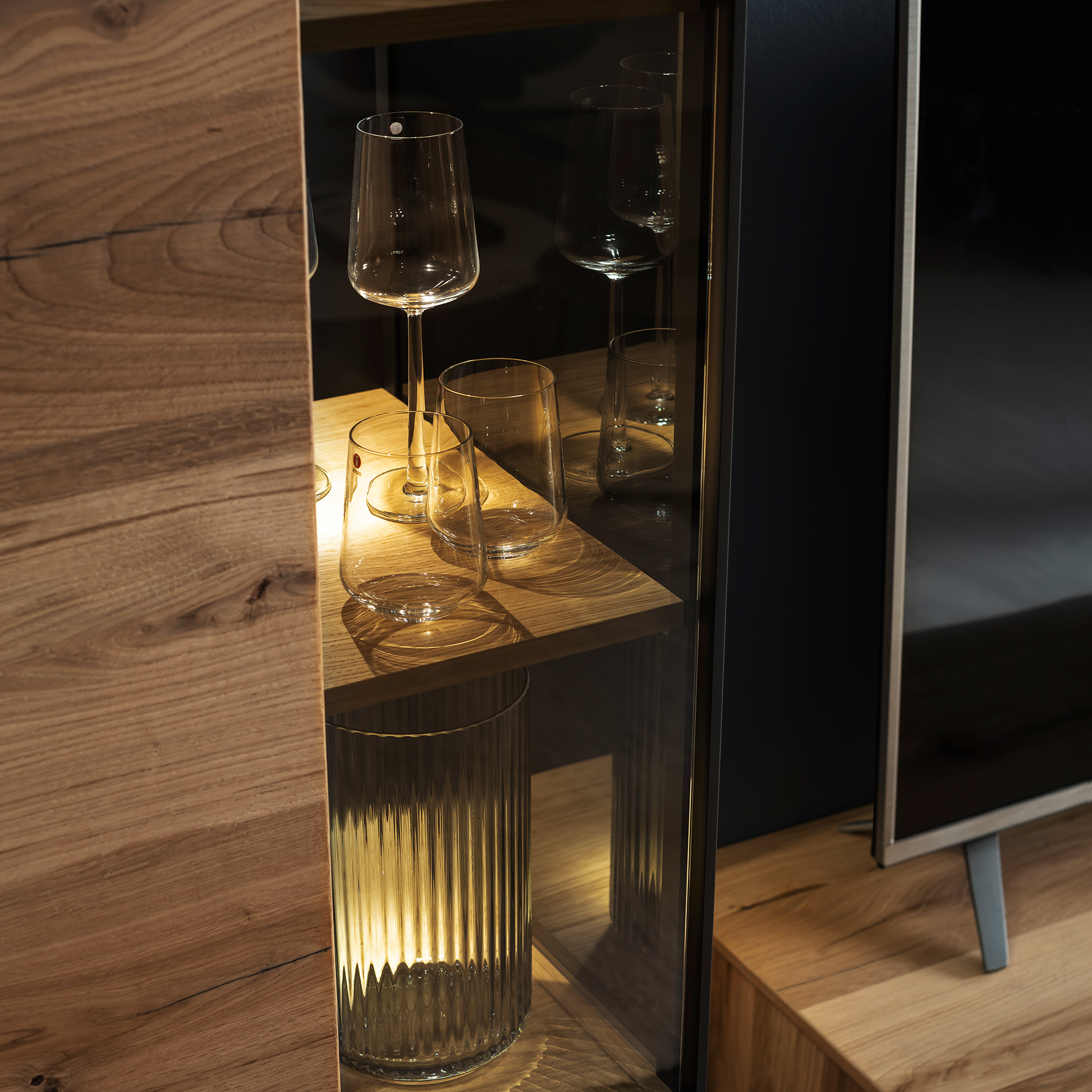 Vitrine, Sideboard, Highboard oder wandhängendes Element – ANDRA lässt sich vielseitig kombinieren und fügt sich elegant in Wohn- und Essbereich ein. Das TV-Gerät? Verschwindet wie nebenbei ins harmonische Gesamtbild. Und je nach Wunsch: mit Fussgestell für leichte Optik oder bodennah für markante Präsenz.