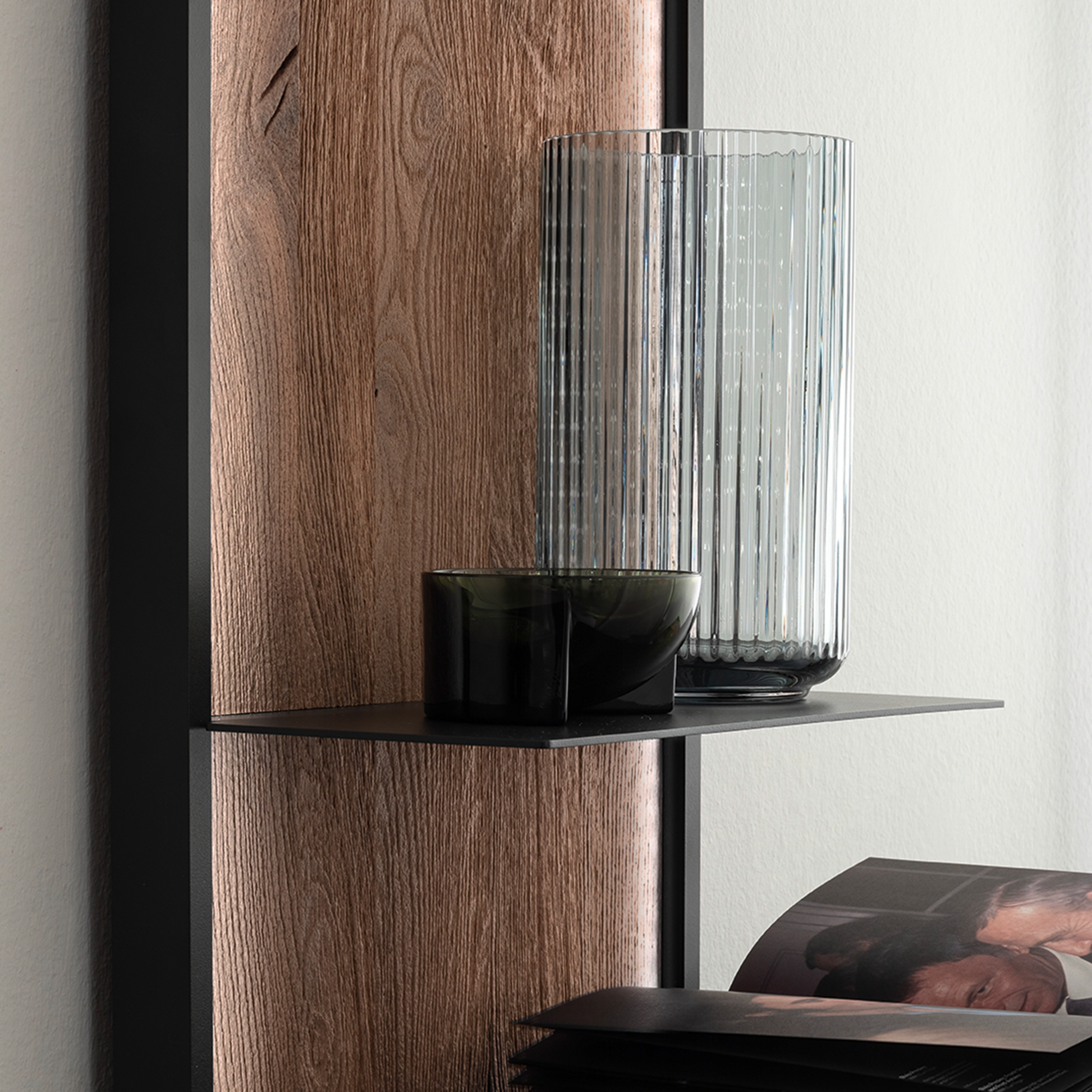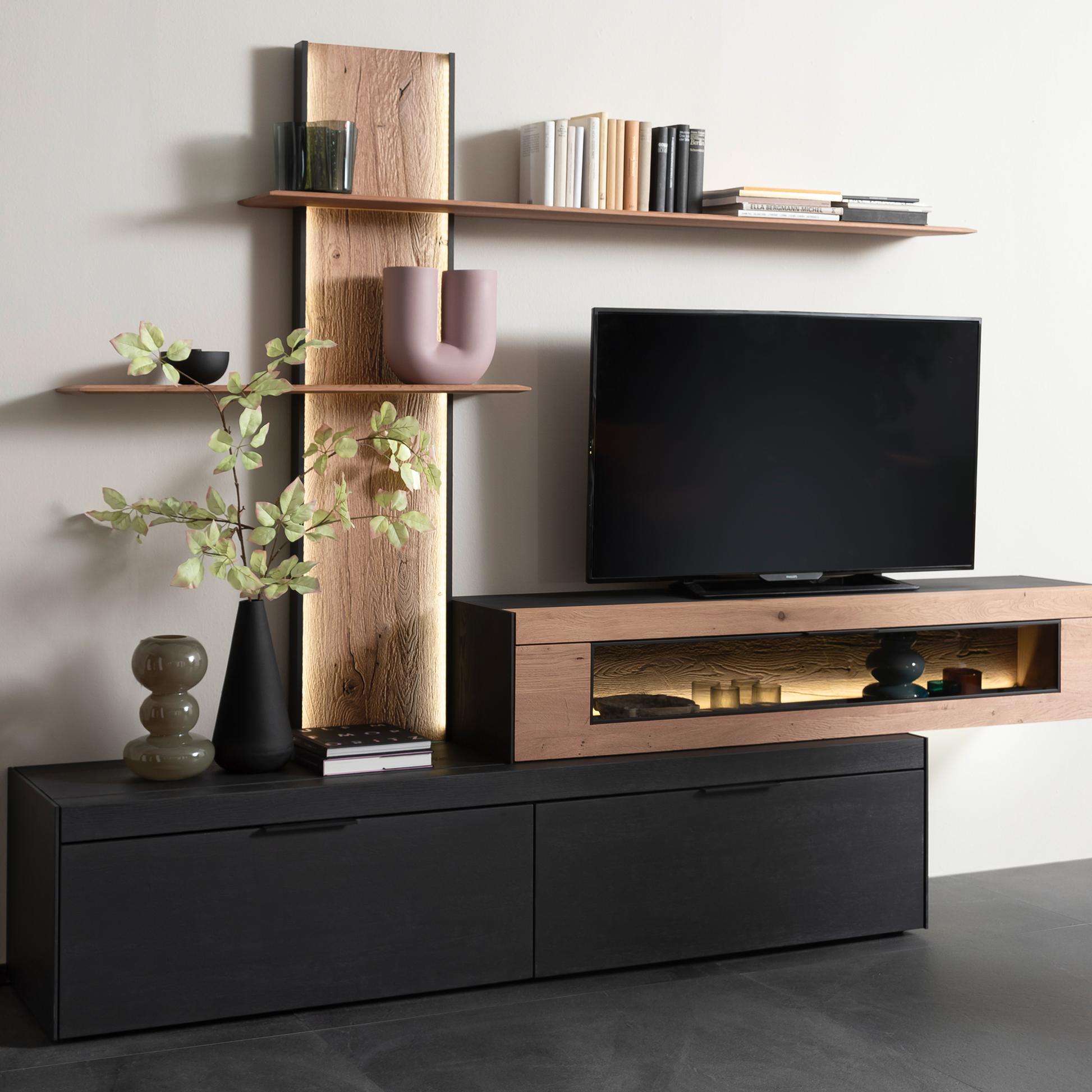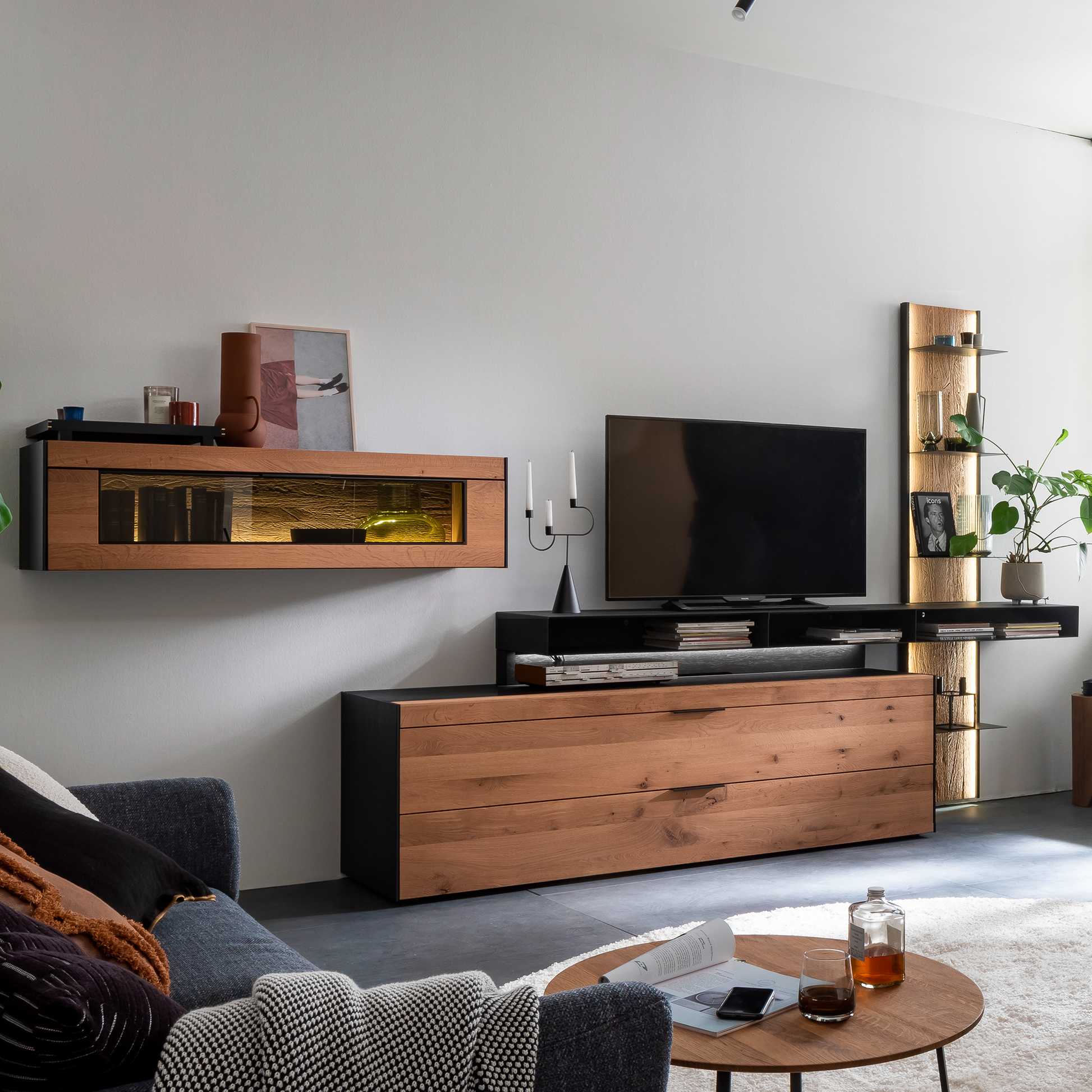Mit der optionalen Beleuchtung setzen Sie Vitrinen, Borde und Paneele perfekt in Szene. Die strukturierte Rückwand aus Riffeiche wirkt durch das Licht noch plastischer und sorgt für eine stimmungsvolle Atmosphäre in Ihrem Wohnraum.