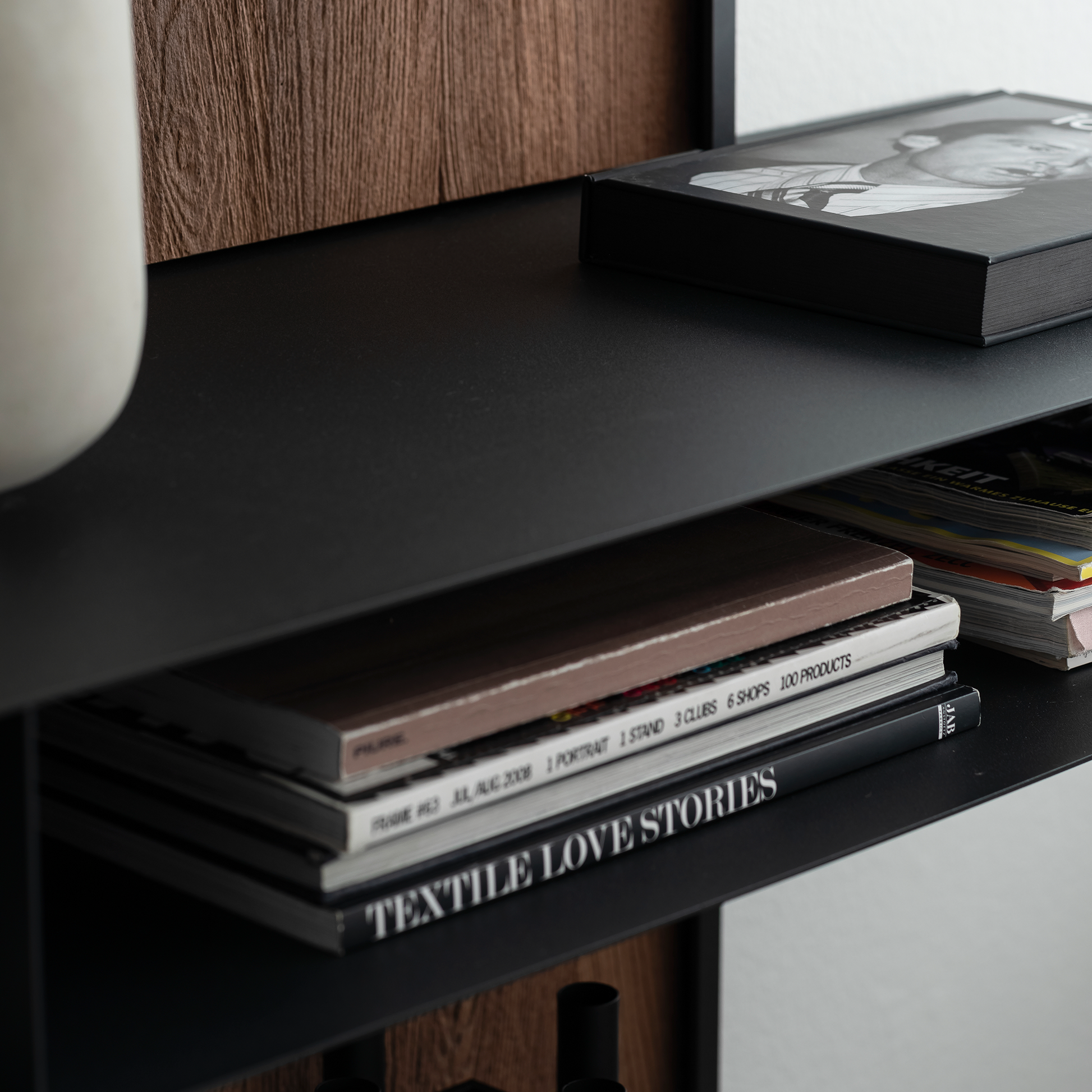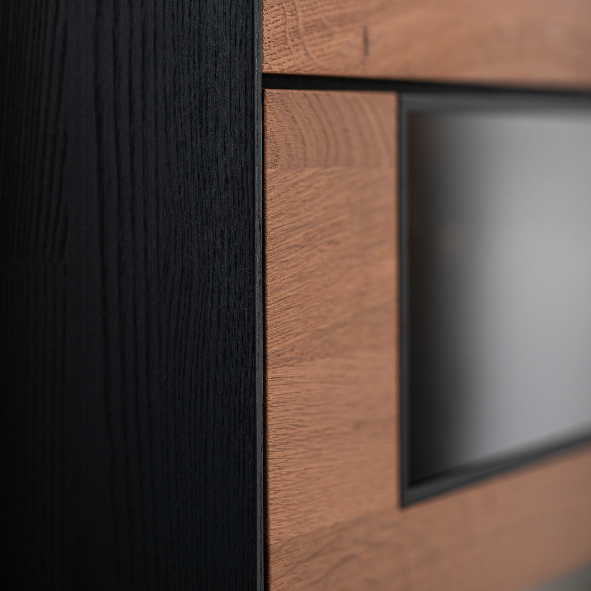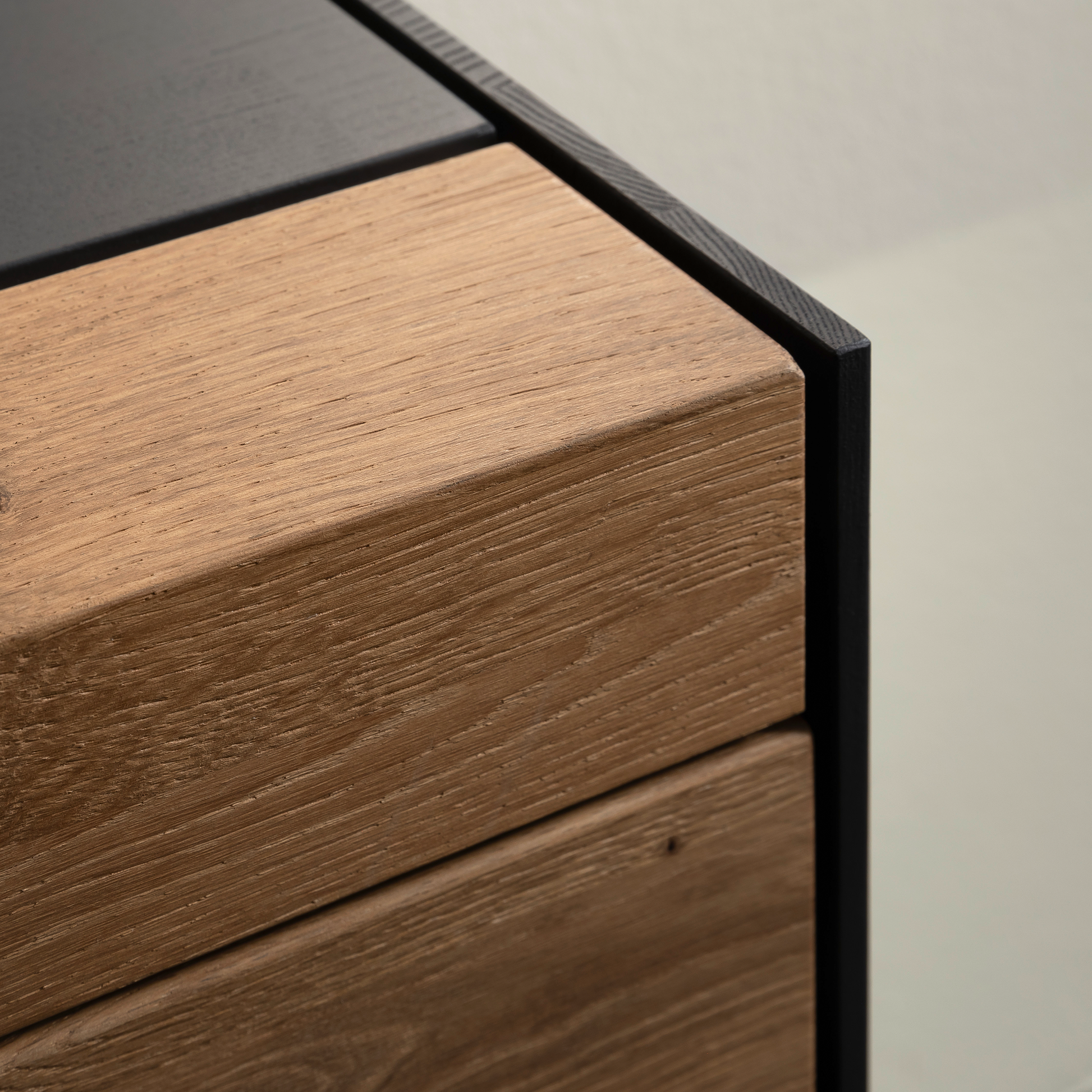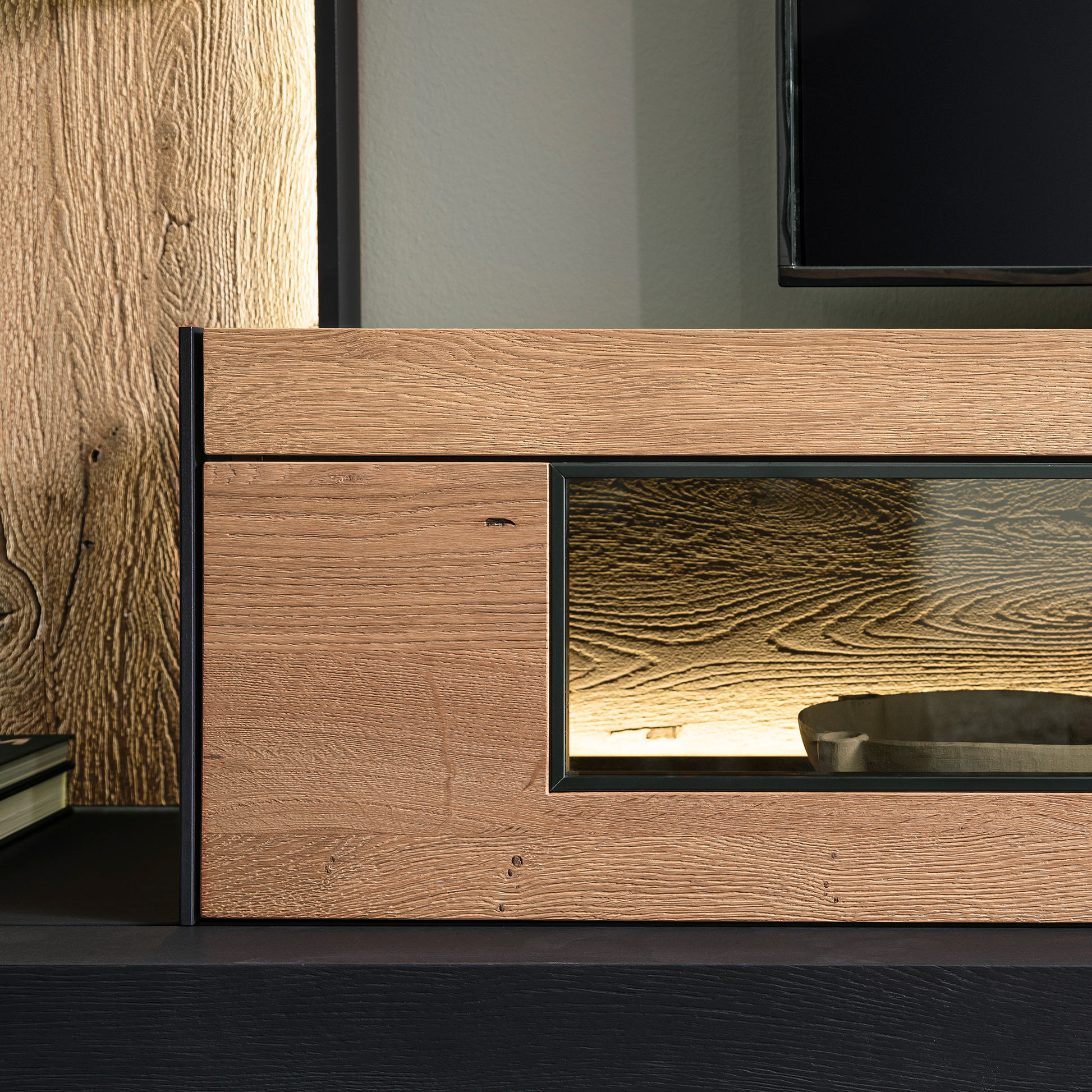 Die klare, kubische Formensprache verleiht den Möbeln eine moderne Schlichtheit, während das mehrfach sandgestrahlte Riffholz mit seiner einzigartigen Struktur für Wärme und Charakter sorgt. Der gekonnte Materialmix macht jedes Möbelstück zu einem besonderen Blickfang: Je nach Variante trifft schwarz gebeizte Kerneiche auf warme Töne der Kerneiche «umato» und wird durch kühles Metall stilvoll ergänzt.