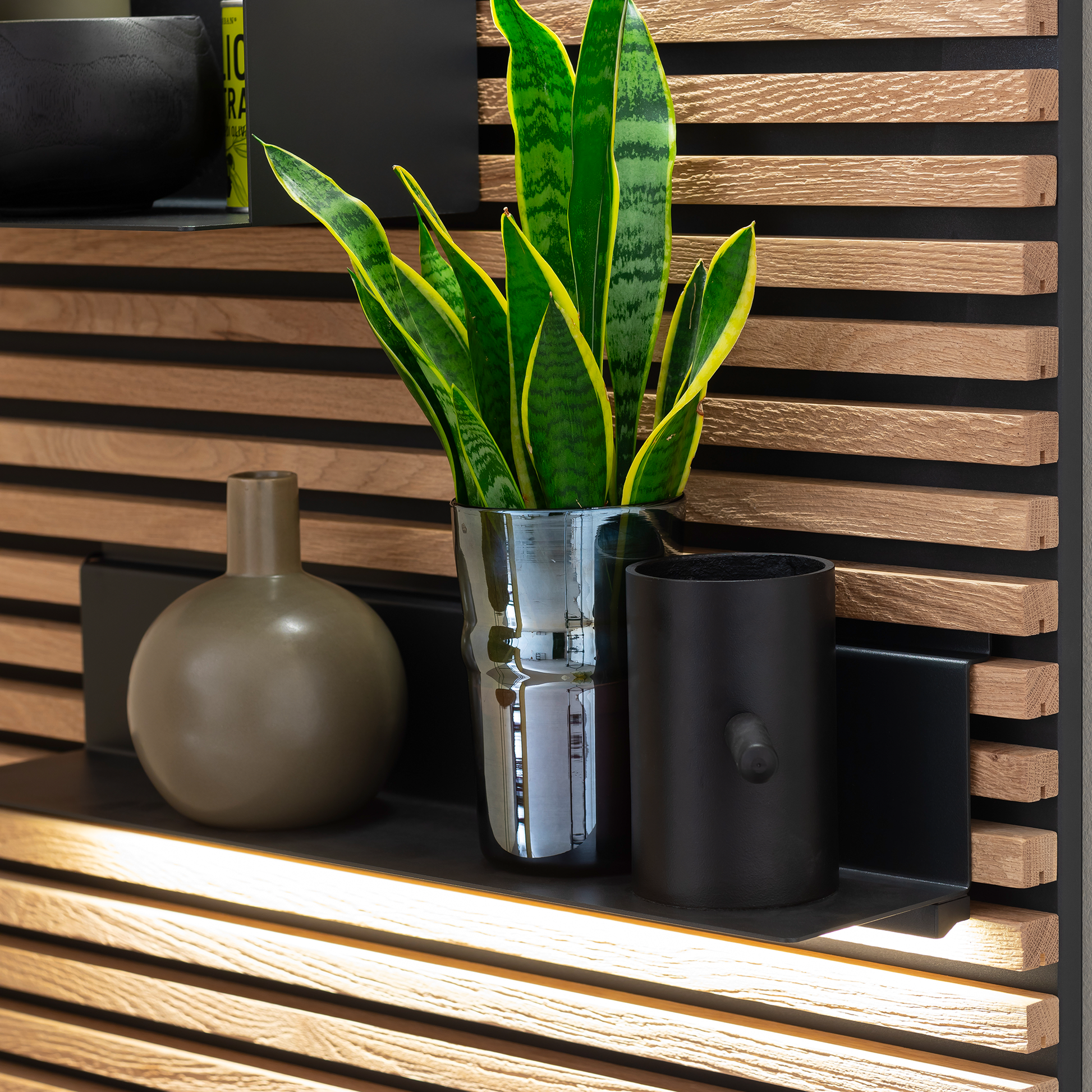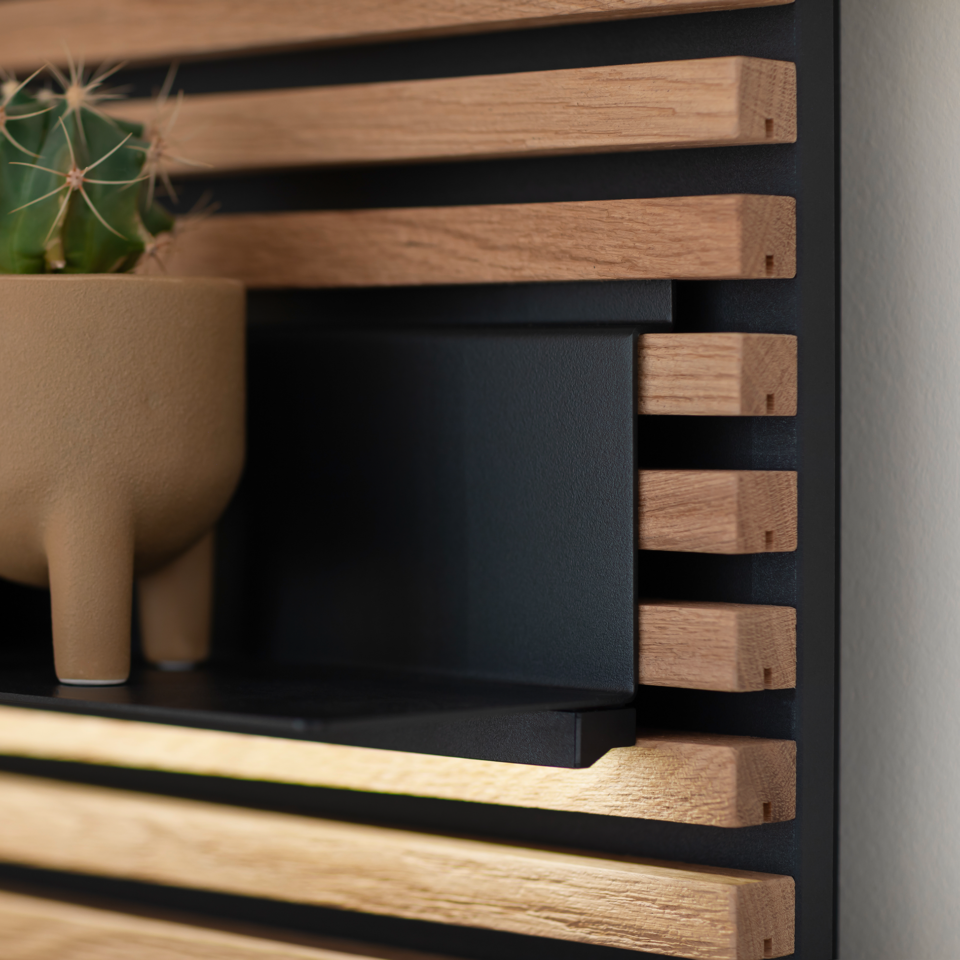 Das Stauraumprogramm YONNA aus der SCHÖNER WOHNEN-Kollektion kombiniert minimalistische Lackelemente mit einem Paneel aus rustikalen Holzlamellen und zeigt, wie ein modernes Massivholzmöbel für alle Wohnbereiche heute aussehen muss. Hinter den lackierten Türen und Schubkästen überrascht eine Optik aus massivem Holz. Vitrinen, Regalelemente, Sideboards und Highboards ganz aus Holz sind Solisten, die sich aber auch im Duett mit den Kombi-Lackmöbeln wohlfühlen. Schön und praktisch: Die Paneel-Elemente, an denen beleuchtete Metallregale nach Lust und Laune eingehängt werden können.